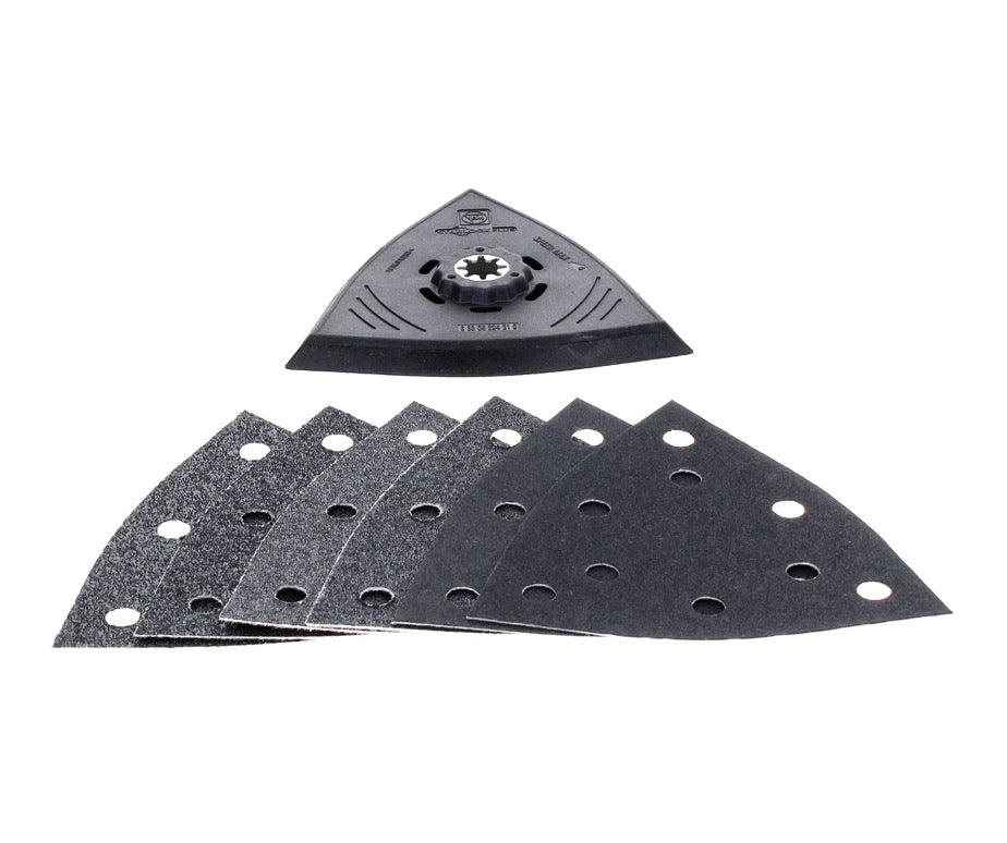 - 1x Gelochte Dreiecks-Schleifplatte (Kantenlänge 130 mm)