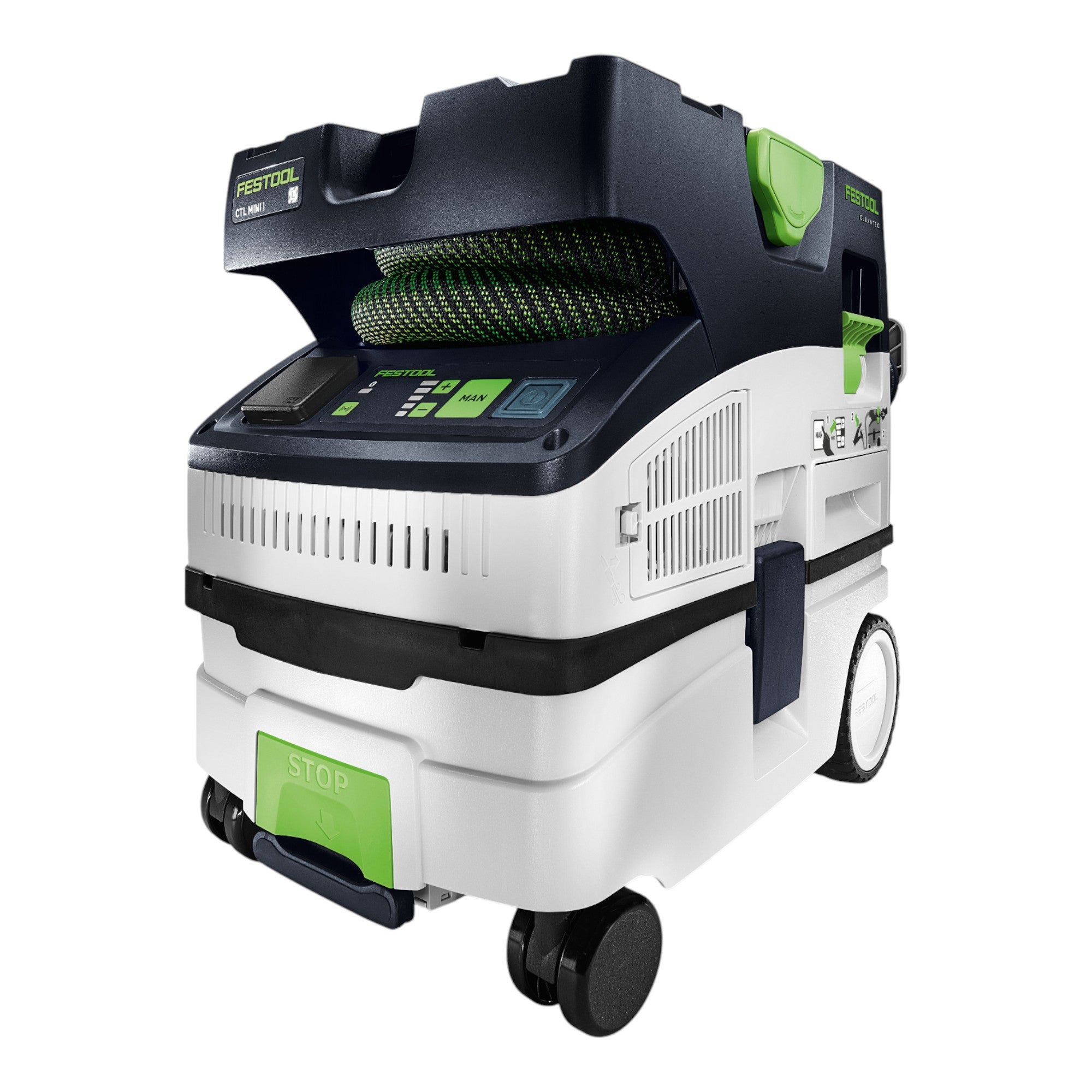 Festool CTL MINI I to wydajny, kompaktowy odkurzacz mobilny, który zachwyca zaawansowaną technologią, wysoką funkcjonalnością i maksymalną mobilnością - idealny do prac serwisowych i montażowych, czyszczenia końcowego lub odciągania przy mniejszych pracach szlifierskich, frezarskich, piłowania lub wiercenia. Dzięki niewielkiej wadze, kompaktowym wymiarom i solidnej obudowie odkurzacz jest idealny do elastycznego użytkowania w ruchu. Intuicyjna obsługa dotykowa, automatyczne gniazdo dla narzędzi przewodowych i zintegrowana technologia Bluetooth® do automatycznego uruchamiania za pomocą akumulatora lub pilota zdalnego sterowania zapewniają maksymalną wygodę. Gładki, stożkowo ukształtowany wąż ssący zapobiega zaczepianiu i gwarantuje niezmiennie wysoką wydajność ssania. Ręczny system czyszczenia filtra i worka filtrującego oraz filtr główny, który można wymienić z zewnątrz, zapewniają zdrową i długotrwałą pracę. Wewnętrzny schowek na wąż, sprytne zwijanie kabla i złącze T-LOC do szybkiego podłączania do Systainerów zapewniają porządek. Płaska powierzchnia do przechowywania oferuje dodatkowe miejsce na narzędzia i materiały. Funkcja antystatyczna zapobiega gromadzeniu się ładunków elektrostatycznych podczas pracy, a system LevelStop automatycznie wyłącza urządzenie podczas odkurzania na mokro, gdy tylko pojemnik jest pełny - silnik pozostaje chroniony. Odkurzacz jest dopuszczony do pracy z pyłami klasy L (dla pyłów o wartościach granicznych > 1 mg/m³) i maksymalnie wykorzystuje swoją objętość dzięki optymalnemu wykorzystaniu pojemnika. Wszechstronne urządzenie zapewniające czyste rezultaty w każdym środowisku pracy.