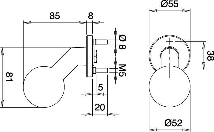 wykonana ze stali nierdzewnej - na okrągłej rozecie - głowica kulowa z korbką - rozeta Ø 55 mm - wysokość 85 mm - grubość rozety 8 mm - rozstaw otworów na śruby 38 mm