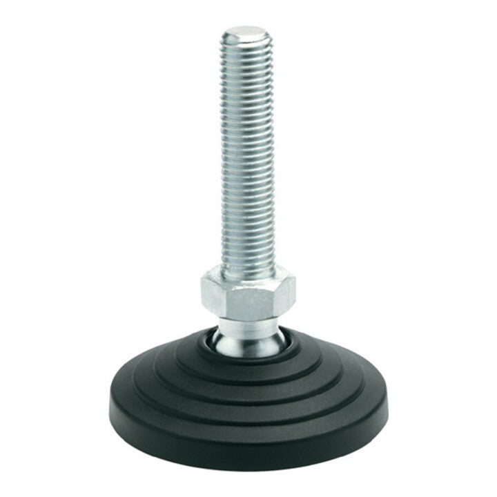 z nakrętką, z gumową podkładką - Podane w tabeli wartości nośności statycznej są wartościami orientacyjnymi; w przypadku ich przekroczenia może dojść do trwałego odkształcenia lub pęknięcia tarczy z tworzywa sztucznego Podane w tabeli wartości nośności statycznej są wartościami orientacyjnymi, których przekroczenie może prowadzić do trwałego odkształcenia lub pęknięcia płyty z tworzywa sztucznego - Wersja: Podstawa z tworzywa sztucznego Termoplast (poliamid PA), wzmocniony włóknem szklanym, czarny, matowy, odporny na temperaturę do 100 °C - Wrzeciono regulacyjne Stal ocynkowana, pasywowana na niebiesko - Klasa wytrzymałości 5.8 - Nakrętka sześciokątna ISO 4032: Stal ocynkowana, pasywowana na niebiesko - Podkładka gumowa (NBR): 70 Shore A, czarna Inne wersje na zapytanie