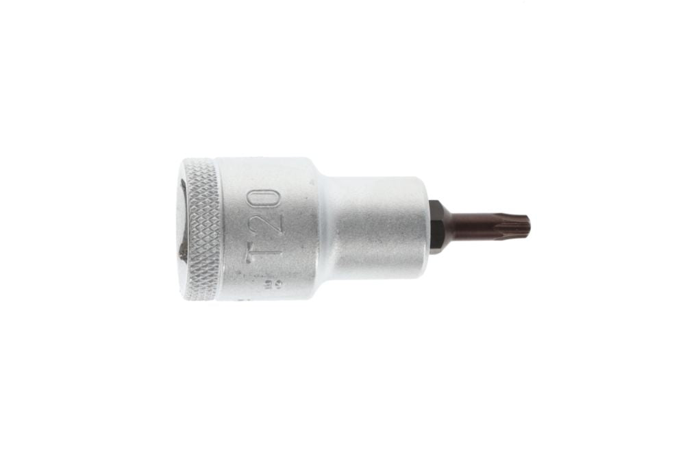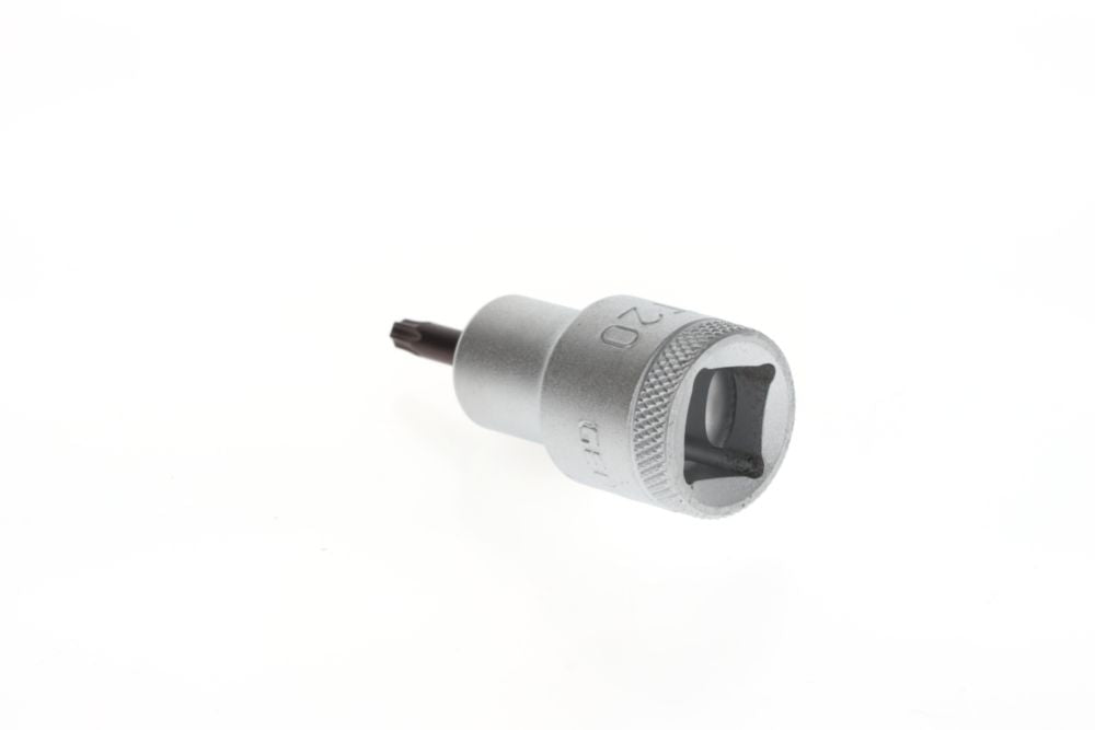 Napęd kwadratowy 12,5 mm (1/2″) - do wkrętów z wewnętrznym profilem TORX® - wkładka ze stali wanadowej - ostrze ze specjalnej stali czernionej - radełkowana z rowkiem na kulkę - DIN 3120 / ISO 1174