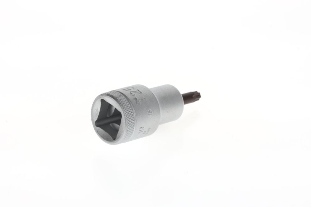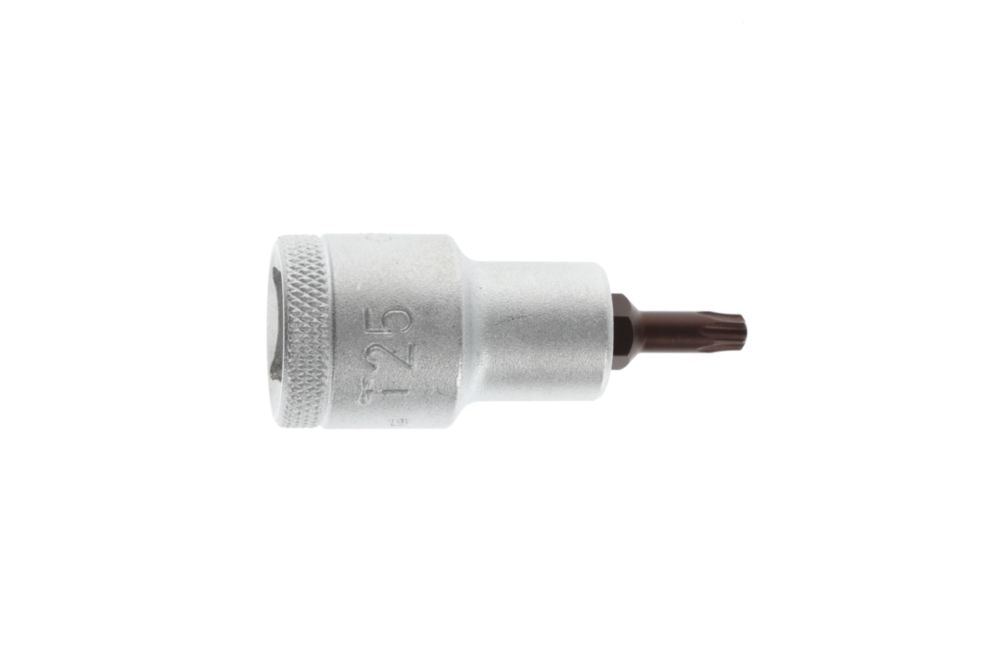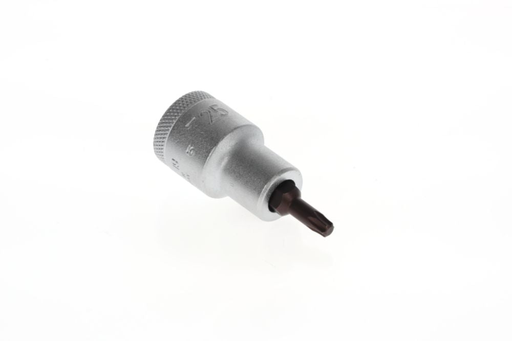 Napęd kwadratowy 12,5 mm (1/2″) - do wkrętów z wewnętrznym profilem TORX® - wkładka ze stali wanadowej - ostrze ze specjalnej stali czernionej - radełkowana z rowkiem na kulkę - DIN 3120 / ISO 1174