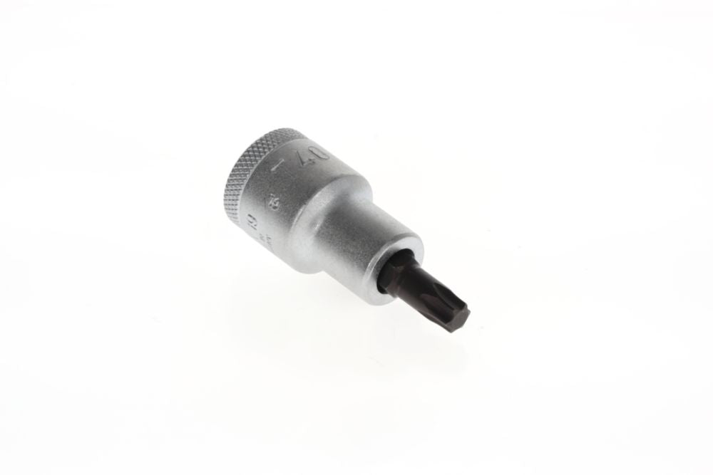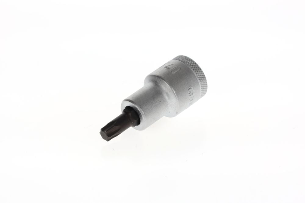 Napęd kwadratowy 12,5 mm (1/2″) - do wkrętów z wewnętrznym profilem TORX® - wkładka ze stali wanadowej - ostrze ze specjalnej stali czernionej - radełkowana z rowkiem na kulkę - DIN 3120 / ISO 1174