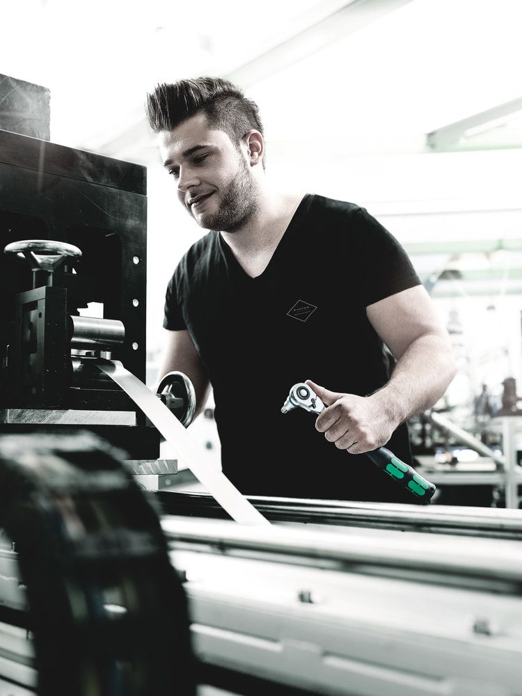 Napęd kwadratowy 12,5 mm (1/2″) - z rękojeścią Kraftform i adaptowalnym przedłużeniem - wykonana ze stopowej stali narzędziowej - funkcja blokowania nakrętki z przyciskiem zwalniającym - smukła, długa konstrukcja