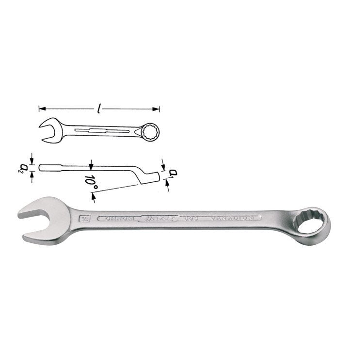 Stal CV - chromowane - z równymi szerokościami klucza - strona pierścienia 10° z korbą, pozycja szczęk 15° - szerokość klucza 5,5 do 9 mm strona pierścienia z sześciokątem, od szerokości klucza 10 mm strona pierścienia z podwójnym sześciokątem DIN 3113 forma B / ISO 3318 / ISO 7738