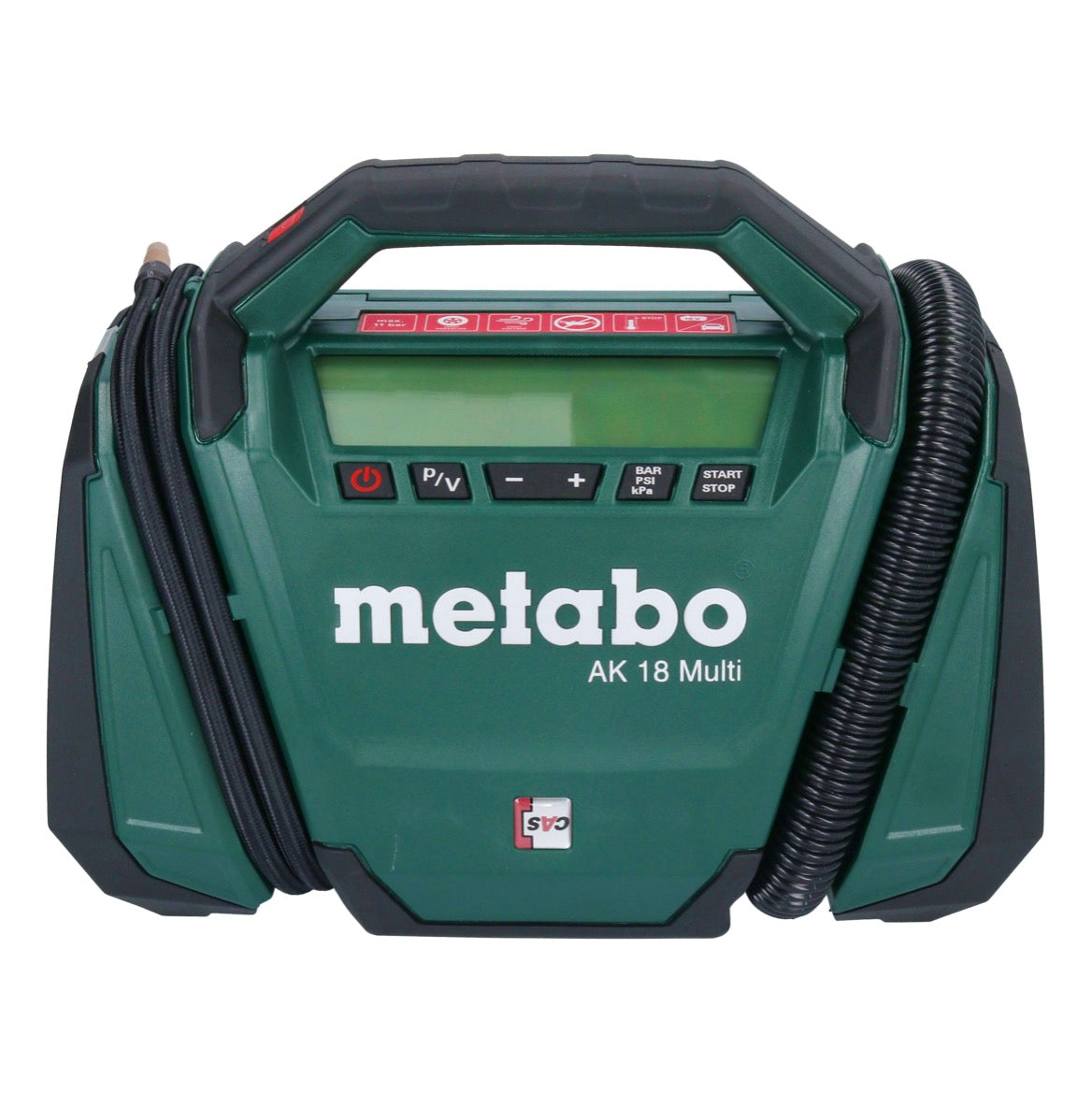 Metabo AK 18 Multi to wielofunkcyjny kompresor akumulatorowy, który jest wszechstronny do pompowania opon, piłek, materacy powietrznych i wielu innych. Dzięki funkcji wysokiego ciśnienia umożliwia wygodne pompowanie opon samochodowych i rowerowych. Funkcja objętościowa kompresora umożliwia również szybkie pompowanie i opróżnianie nadmuchiwanych produktów, takich jak łóżka dla gości, materace powietrzne i akcesoria basenowe. Duży, kontrastowy wyświetlacz pokazuje wybraną funkcję, aktualne ciśnienie i ustawione ciśnienie docelowe. Ciśnienie może być wyświetlane w jednostkach bar, psi i kPa. Po osiągnięciu ustawionego ciśnienia docelowego sprężarka wyłącza się automatycznie. Do użytku w ciemności lub przy słabej widoczności, AK 18 Multi posiada jasne światło LED, które oświetla obszar użytkowania. Kompresor może być zasilany z akumulatorów 18 V lub alternatywnie może być używany z kablem samochodowym 12 V. Kolejną zaletą AK 18 Multi jest to, że można go łączyć ze wszystkimi akumulatorami 18 V i ładowarkami marek CAS.