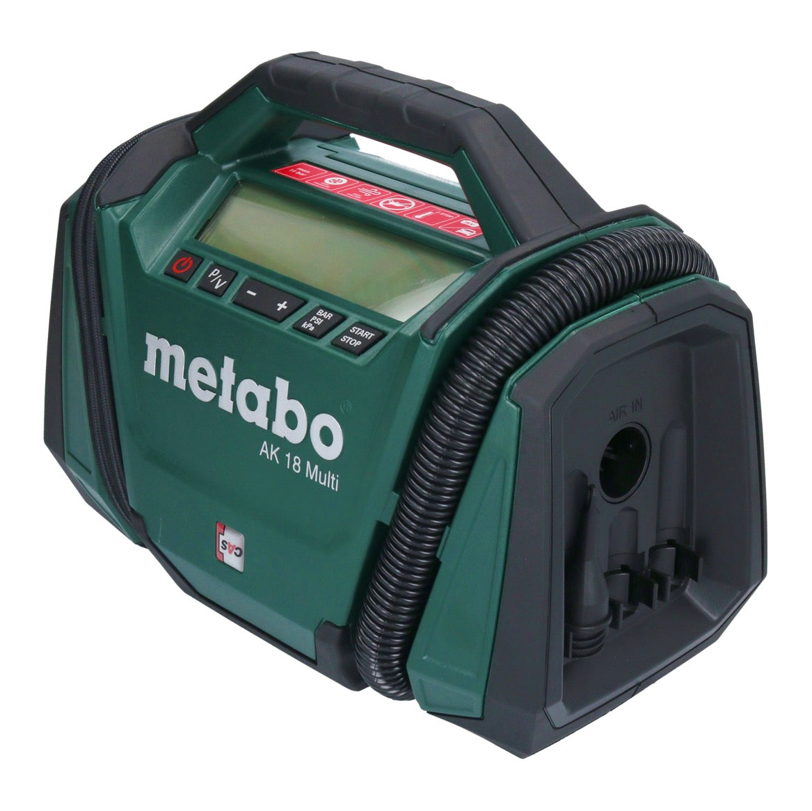 Metabo AK 18 Multi to wielofunkcyjny kompresor akumulatorowy, który może być używany na wiele sposobów do pompowania opon, piłek, materacy powietrznych i wielu innych. Dzięki funkcji wysokiego ciśnienia umożliwia wygodne pompowanie opon samochodowych i rowerowych. Funkcja objętościowa kompresora umożliwia również szybkie pompowanie i opróżnianie nadmuchiwanych produktów, takich jak łóżka dla gości, materace powietrzne i akcesoria basenowe. Duży, kontrastowy wyświetlacz pokazuje wybraną funkcję, aktualne ciśnienie i ustawione ciśnienie docelowe. Ciśnienie może być wyświetlane w jednostkach bar, psi i kPa. Po osiągnięciu ustawionego ciśnienia docelowego sprężarka wyłącza się automatycznie. Do użytku w ciemności lub przy słabej widoczności, AK 18 Multi posiada jasne światło LED, które oświetla obszar użytkowania. Kompresor może być zasilany z akumulatorów 18 V lub alternatywnie może być używany z kablem samochodowym 12 V. Kolejną zaletą AK 18 Multi jest to, że można go łączyć ze wszystkimi akumulatorami 18 V i ładowarkami marek CAS.