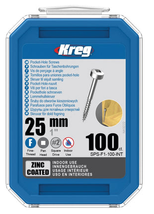KREG Śruba z łbem walcowym z otworem gniazdowym 25mm 500szt. ( SPS-F1-500 ) Napęd kwadratowy Gwint częściowy Gwint drobnozwojny Samogwintująca ocynkowana