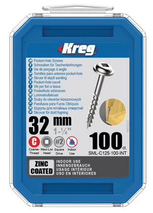 KREG Wkręt z łbem walcowym 32 mm 100 szt ( SML-C125-100 ) Napęd kwadratowy Gwint częściowy Gwint zgrubny Samogwintujący ocynkowany