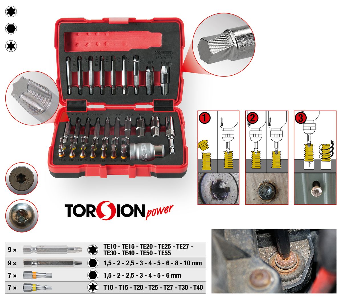 • spezielles, linksdrehendes Schneidgewinde mit konisch zulaufenden Schneiden für Torx-Schrauben und speziell geformte Ausdreher für Innensechskant-Schrauben