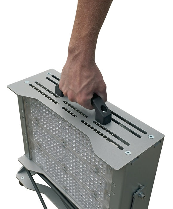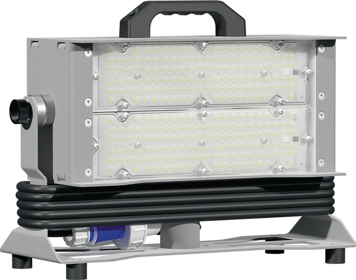 Uniwersalny reflektor LED do montażu na statywie lub na podłodze - Aluminiowa obudowa, malowana proszkowo na kolor srebrnoszary - Stalowy wspornik, malowany proszkowo na kolor srebrnoszary z 4 gumowymi nóżkami - Wytrzymały uchwyt do przenoszenia z czarnego tworzywa sztucznego - Głowicę świetlną można precyzyjnie regulować w krokach co 6° - Przezroczysta osłona z PC - Z optyką soczewkową - Zintegrowany uchwyt króćca DIN zgodnie z DIN 1464 - Wymiary dł. 446 x szer. 172 mm, wys. 172 mm 446 x szer. 172 x wys. 334 mm
