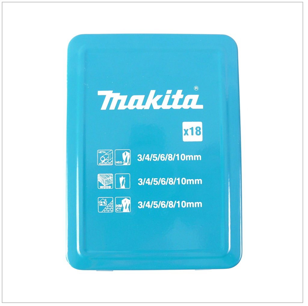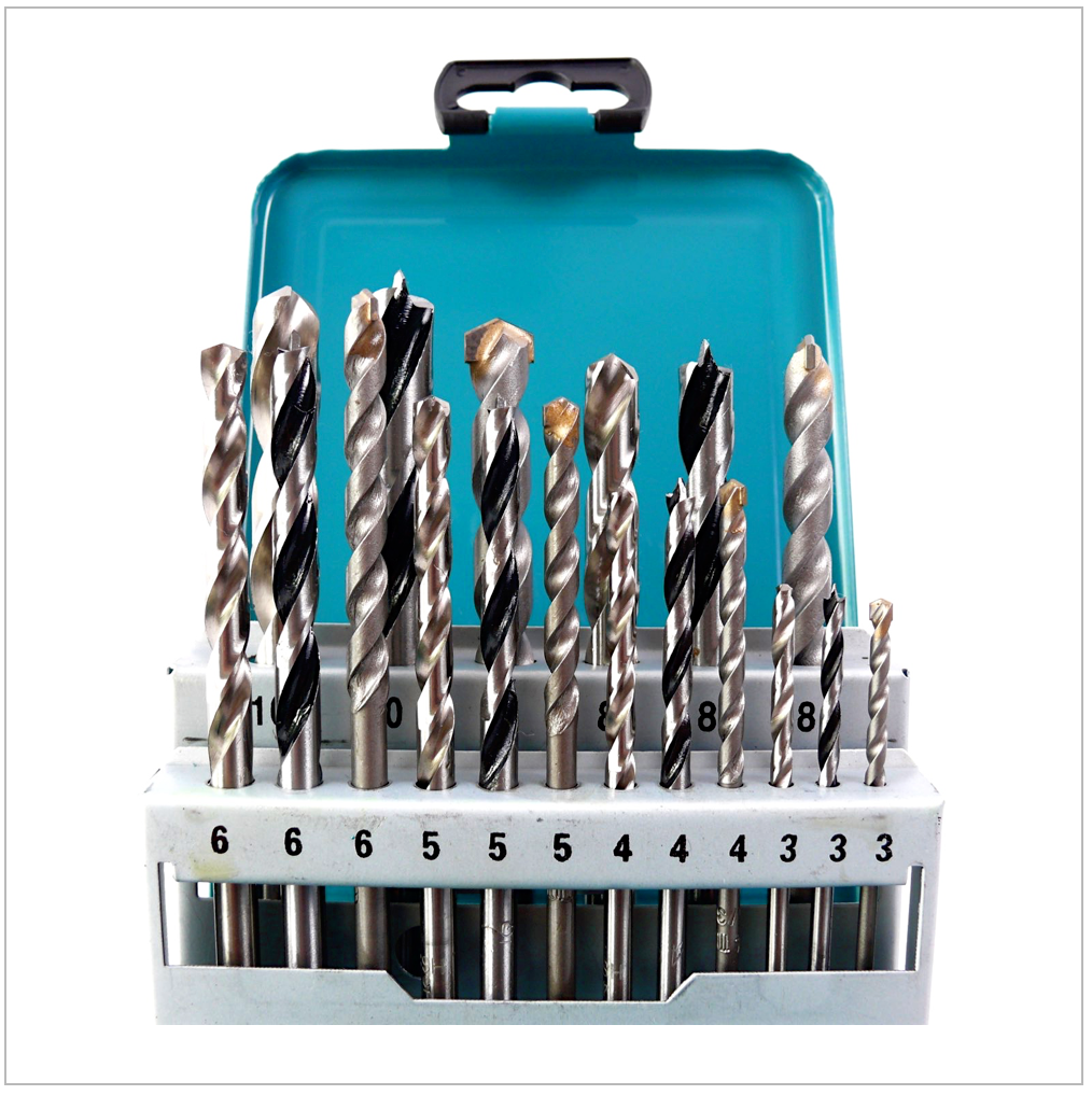 Das Makita Bohrer - Set beinhaltet 18 verschiedene Bohrköpfe, in je 6 verschiedenen Größen, geeignet für Holz-, Metall- und Steinbohrungen. Geliefert wird das Bohrer - Set in einer kleinen Blechbox von Makita, mit einer passformen Vorrichtung für die einzelnen Bohrköpfe.