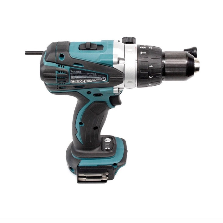 - 1x akumulatorowa wiertarko-wkrętarka udarowa Makita DHP 458 18V Li-ion solo