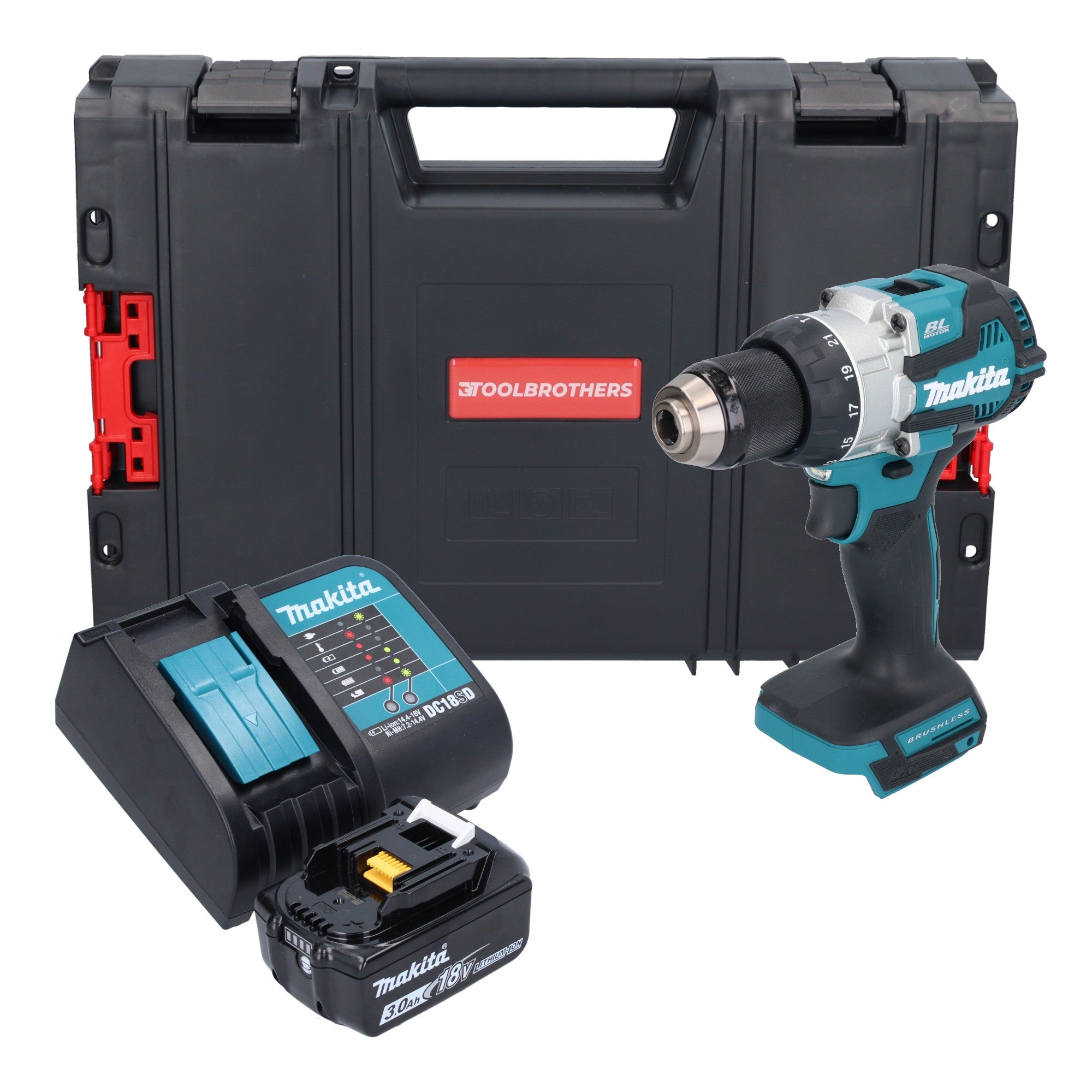 Makita DHP 489 SF1J-R akumulatorowa wiertarko-wkrętarka udarowa 18 V 73 Nm bezszczotkowa + 1x akumulator 3,0 Ah + ładowarka + RHINO