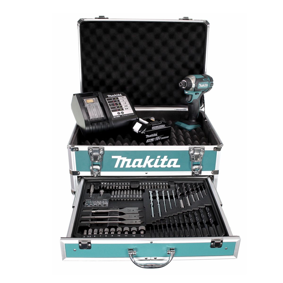 Der kraftvolle Makita DTD 152 Akku-Schlagschrauber ist mit seinem perfekt ergonomisch geformten Griff und seiner kurzen Bauform von nur 138mm ein Muss für jeden Handwerker. Durch die robuste Bauweise mit Schutzkappen am Gehäuse und Gummiabdichtungen gegen Staub und Spritzwasser ist der Makita DTD 152 Schlagschrauber äußerst belastbar. Die integrierte LED Beleuchtung macht auch Arbeiten an weniger gut ausgeleuchteten Stellen problemlos möglich. Durch das in der Schublade vorhandene 70 teilige Bit und Bohrer Set sind sämtliche Anwendungen abgedeckt. Es sind Bits, Fräser, Steckschlüssel und Bohrer in vielen Varianten vorhanden. Ob Holz, Metall oder Stein der Koffer beinhaltet eine Vielzahl an Bohrern in den gängigsten Größen. Die massive Verarbeitung des Koffers verspricht eine lange Lebensdauer und ist zudem auch echt schön anzusehen. Der gummierte Tragegriff ist schonend für die Handinnenflächen und kann auch problemlos mit Handschuhen genutzt werden. Die Metallschließen des Koffers sind robust und langlebig. Der Noppenschaum im Boden und im Deckel gewährleisten einen sicheren Transport der im Koffer befindenden Maschinen. Durch den Aluminium Koffer von Makita hat man das Arbeitswerkzeug und das entsprechende Zubehör in einem Koffer und sicher gelagert.
