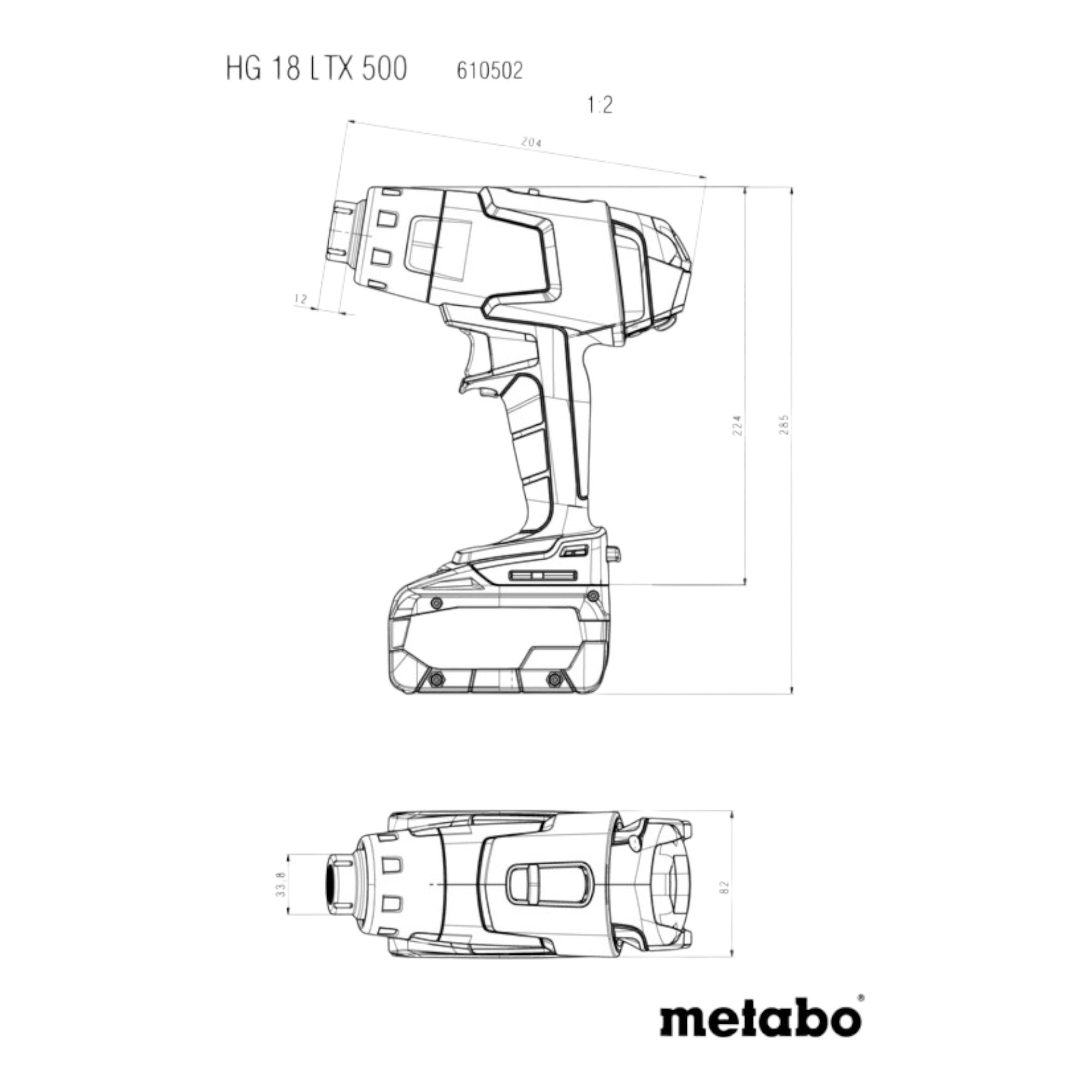 - 1x akumulatorowy pistolet na gorące powietrze Metabo HG 18 LTX 500 18 V - 1x dysza reflektorowa - 1x dysza redukcyjna 9 mm - bez akumulatora, bez ładowarki