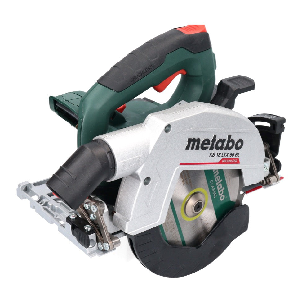 Akumulatorowa, przenośna pilarka tarczowa Metabo KS 18 LTX 66 BL przekonuje uniwersalnym zastosowaniem na placu budowy dzięki stosunkowo niewielkiej masie. Wylot trocin można regulować w wielu pozycjach. Oznacza to, że wszystkie pozycje robocze są możliwe bez żadnych problemów. Dzięki zintegrowanemu oświetleniu LED możliwa jest również praca w miejscach, w których warunki oświetleniowe są trudne. Regulowana pozycja 0° zapewnia najwyższą jakość cięcia. Akumulatorowa przenośna pilarka tarczowa posiada także dobrze widoczny wskaźnik cięcia po uruchomieniu. Obudowa wykonana jest z odlewanego ciśnieniowo aluminium. Miękka powierzchnia uchwytu zapewnia maksymalną przyczepność. Aby zminimalizować ilość trocin w miejscu pracy, można oczywiście podłączyć zewnętrzny system odsysania. Metabo ma długą tradycję w dostarczaniu wszelkiego rodzaju narzędzi. Metabo jest również członkiem CAS Group i dlatego posiada szeroką gamę kompatybilnych narzędzi i akumulatorów innych producentów.