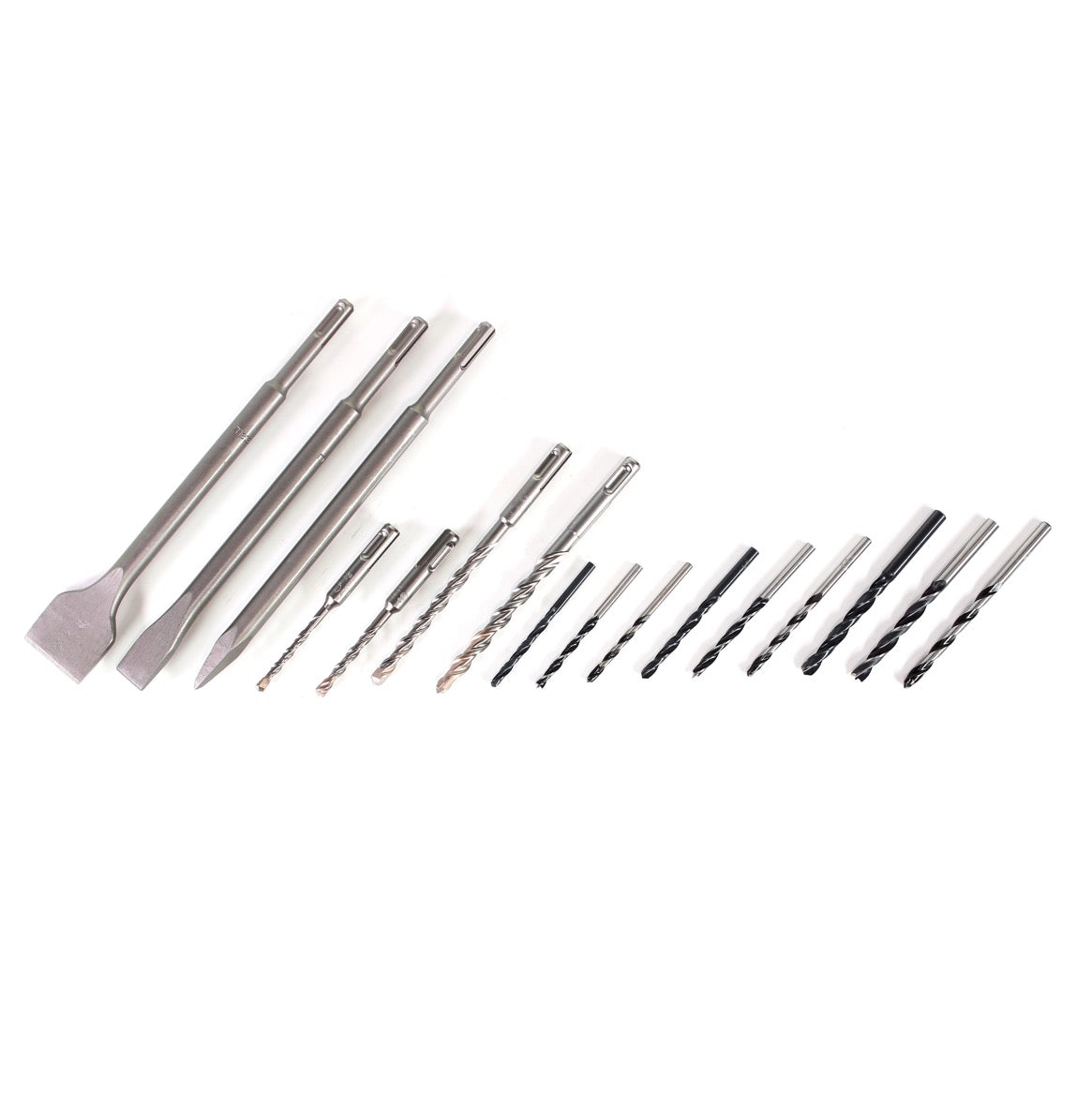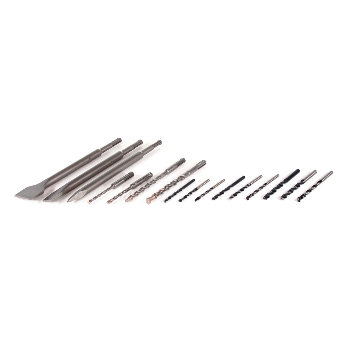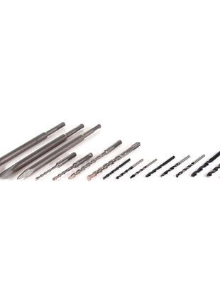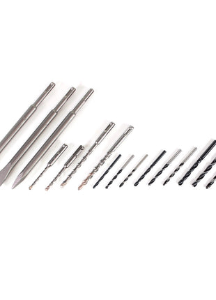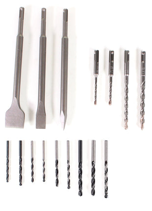Die robusten gehärteten Meißel kennzeichnet eine hohe Materialgüte. Die Meißel bestechen durch gutes Abtragen von Material in größerem Umfang und sind universell einsetzbar. Sie sind bestens geeignet für harte Werkstoffe, für allgemeine Meißel- und Aufbrucharbeiten von Mauerwerk, Beton und losem Gestein. Die Metallbohrer aus Hochleistungs-Schnellarbeitsstahl nach DIN 338 sind rollgewalzt, zylindrisch, rechtsschneidend, Typ N und eignen sich für den Einsatz in Stahl, NE-Metalle, Stahlguss legiert sowie unlegiert. Sie sind bis zu max. 900 N/mm² belastbar. Aufgrund der gefrästen Ausführung und der Hartmetallplatte eignen sich die Steinbohrer für den Einsatz in Ziegel, Mauerwerk, Naturstein usw. Die gehärteten Holzbohrer aus hochwertigem Gütestahl mit Zentrierspitze eignen sich für den Einsatz in Hart- und Weichholz, Sperrholz, Spanplatten usw. Die Hammerbohrer sorgen für höchste Bohrgeschwindigkeit durch Reduzierung der Reibung und verbesserte Schlagübertragung aufgrund spezieller Schneidengeometrie auf dem meißelförmigen Bohrkopf. Dank der stabilen und langlebigen Zentrierspitze stellt das punktgenaue Anbohren kein Problem dar. Power Breakers verursachen Mikrorisse im Material für spürbar schnelleren Bohrfortschritt. Vergrößerte Armierungsphasen verringern die Wahrscheinlichkeit des Verhakens bei Armierungstreffern. Die Großvolumige 2-spiralige Wendelgeometrie mit Kernverstärkung sorgt für schnelle Förderung des Bohrmehls und maximale Bruchsicherheit. Die Hammerbohrer eignen sich zum Einsatz in Beton, Mauerwerk, Naturstein, Granit. Das SDS plus Einstecksystem des Meißel- und Bohrersatzes garantiert einen einfachen Wechsel der Bohrer und eine ausgezeichnete Kraftübertragung. Das 16-teilige Zubehörset ist ein Basis-Set mit Topsellern aus dem Metabo Bohrer-/Meißelsortiment.