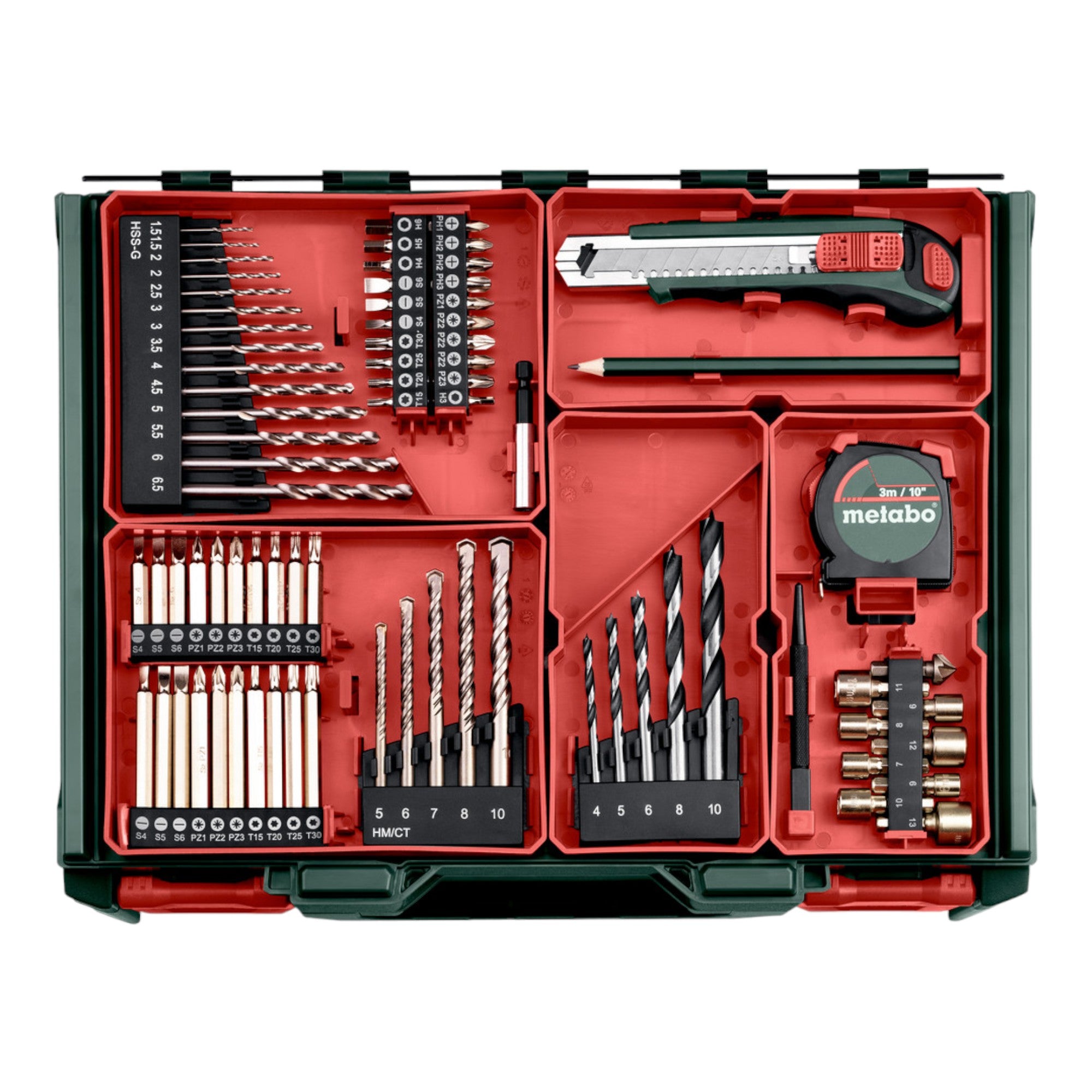 Akumulatorowa wiertarko-wkrętarka udarowa Metabo SB 18 L to niezawodna i wydajna wiertarko-wkrętarka udarowa, która idealnie nadaje się do wszystkich typowych zastosowań związanych z wierceniem i wkręcaniem. Dzięki funkcji wiercenia udarowego może również skutecznie wiercić w murze. Mobilny warsztat z 78 częściami zawiera różnorodne wiertła i końcówki wkrętakowe, które nadają się do szerokiego zakresu zadań. Należą do nich wiertła do drewna, wiertła do muru i wiertła HSS, a także końcówki wkrętakowe o różnych długościach i rozmiarach, uchwyt na bity, klucze nasadowe, pogłębiacz do drewna, kołek centrujący, nóż tnący z zapasowymi ostrzami, taśma miernicza i ołówek. Zintegrowana lampa robocza LED z funkcją afterglow zapewnia optymalną jasność w obszarze roboczym. Praktyczny hak do paska i schowek na bity można zamocować po prawej lub lewej stronie, co ułatwia obsługę i transport narzędzia. Kolejną zaletą Metabo SB 18 L jest kompatybilność ze wszystkimi akumulatorami 18 V i ładowarkami Cordless Alliance System (CAS), co umożliwia elastyczne stosowanie z różnymi markami. Ogólnie rzecz biorąc, akumulatorowa wiertarko-wkrętarka udarowa Metabo SB 18 L oferuje doskonałe połączenie mocy, wszechstronności i wygody, dzięki czemu jest niezastąpionym narzędziem dla profesjonalnych rzemieślników i majsterkowiczów.