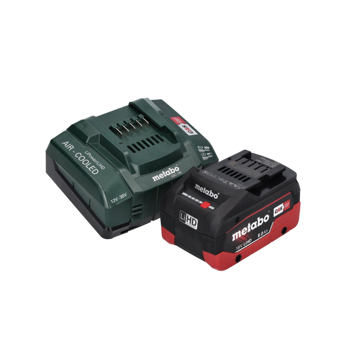 - 1x akumulatorowa wkrętarka udarowa Metabo SSW 18 LTX 800 BL - 1x akumulator litowo-jonowy Metabo LiHD 18 V 8,0 Ah ( 625369000 ) system CAS - 1x ładowarka Metabo ASC 145 ( 627378000 ) - 1x Metabo metaBOX 145