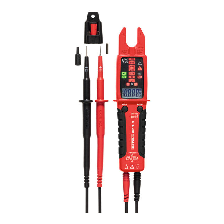 - Dostarczany z uchwytem na pasek, przewodami pomiarowymi, gumowaną osłoną końcówki stykowej, nasadkami (CAT III/IV), powiększeniem końcówki stykowej (Ø 4 mm), bateriami (2 x typ AAA), baterie zamienne patrz nr art. 4000 901 810