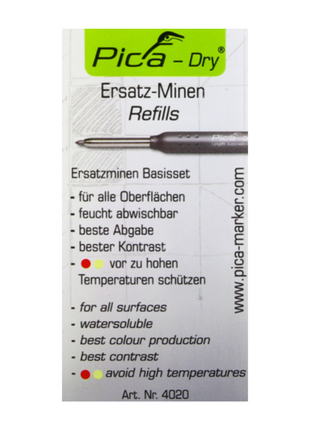 Die Pica Dry Mine Bunt eignet sich für fast alle Oberflächen, egal ob trocken oder feucht, glatt oder rau, staubig oder ölig, hell oder dunkel. Die Markierungen sind von glatten Flächen feucht abwischbar. Die bunten Minen gewährleisten beste Abgabe und besten Kontrast auf den Materialien. Die Minen sind bereits angespitzt und sind in der praktischen Pica Dry Kunststoffbox gelagert.