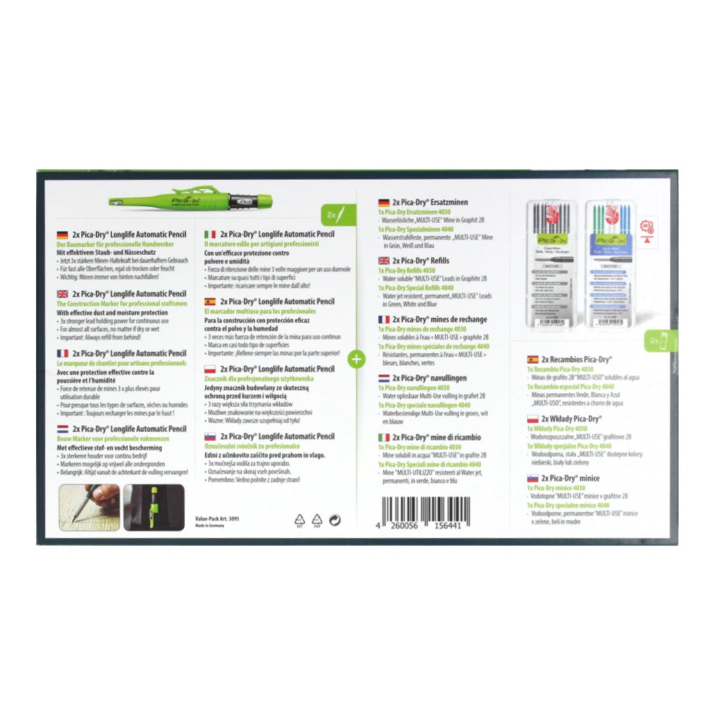 Der Pica DRY Longlife Automatic Pen ist ein professioneller Handwerker Baumarker und ist mit einer speziellen FOR ALL Graphitmine 2B ausgestattet, welche Markierungen auf fast allen Oberflächen egal ob glatt oder rau, trocken oder feucht, staubig oder ölig ermöglicht. Zusätzlich sind Ihre Markierungen auf glatten Flächen sogar wieder feucht abwischbar und der Tieflochmarker ist mit verbessertem Staub- und Nässeschutz versehen. Der praktische Köcherschoner verfügt über einen Spezial-Clip für das einhändige Arbeiten und ist mit dem patentierten, integrierten Spitzer versehen. Die hochwertige Druckmechanik sichert einen automatischen Minenvorschub im Edelstahlrohr und die Minen sind dadurch höchst einfach von hinten nachfüllbar. Der Pica DRY Automatic Pen ist dank hochwertiger Produkttechnik und Nachfüllbarkeit extrem langlebig und nachhaltig  und bietet vielfältigste Einsatzmöglichkeiten dank spezieller farbiger Ersatz-Minen: für helle oder dunkle Oberflächen, sowohl in wasserlöslich oder auch in wasserfest.