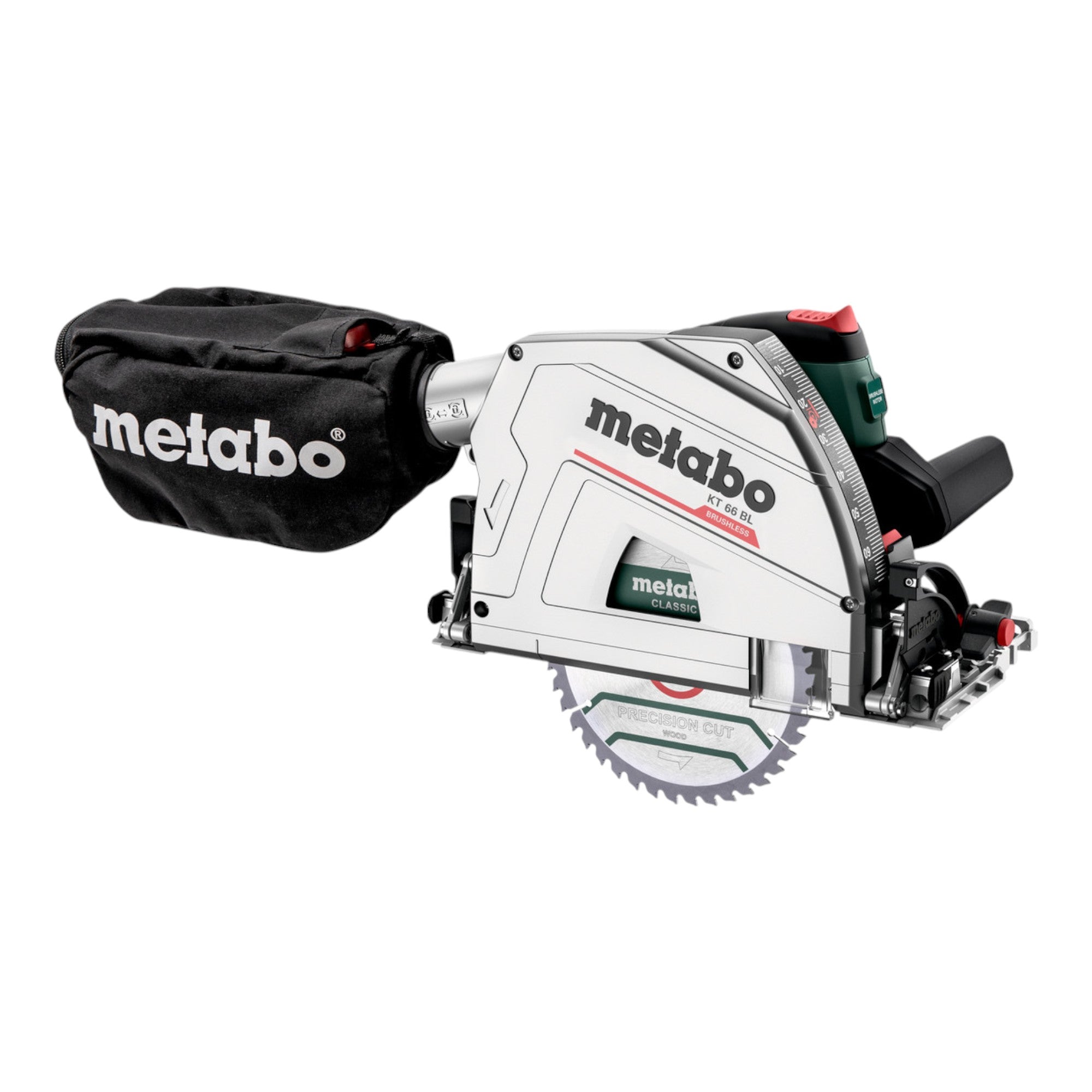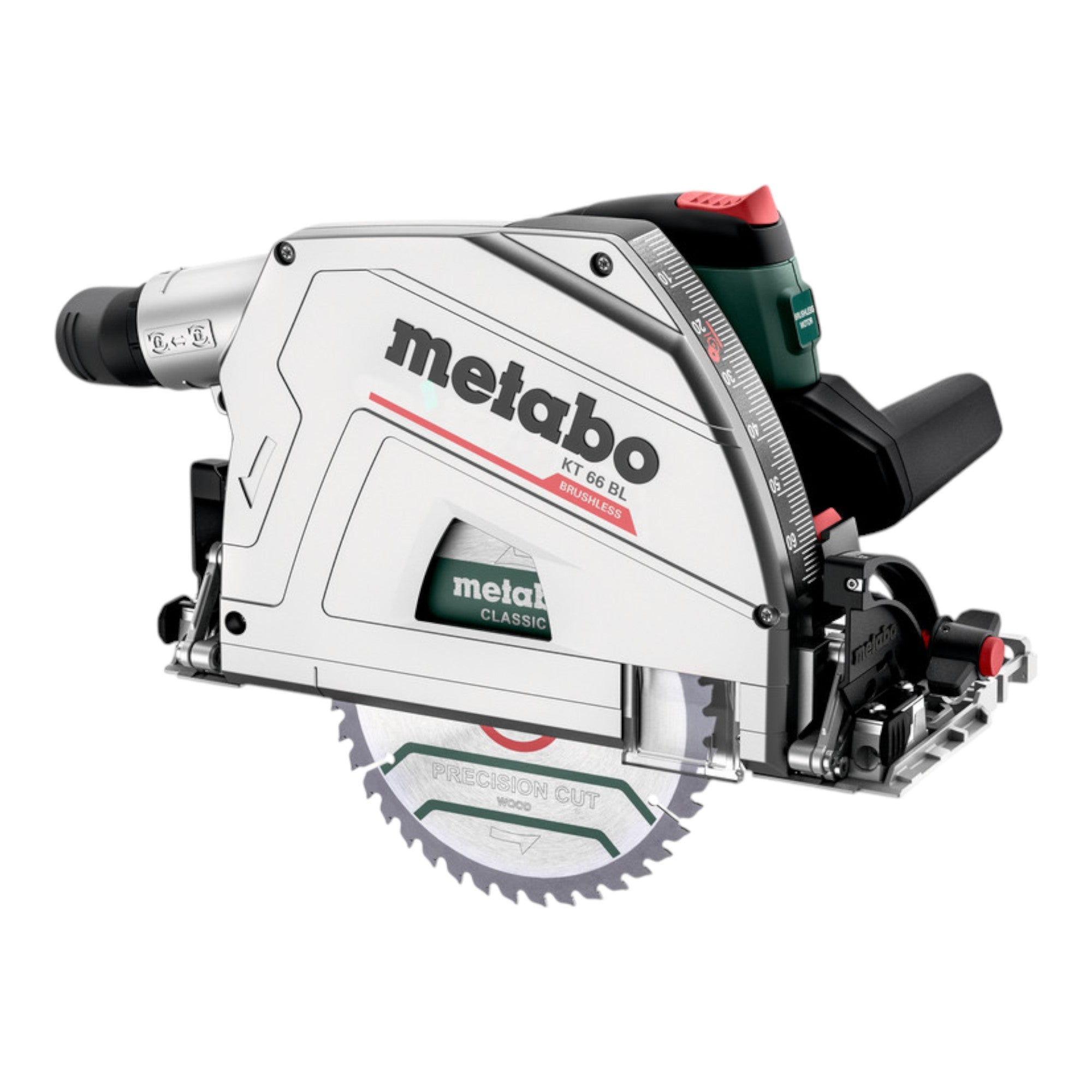 Zagłębiarka Metabo KT 66 BL to idealne narzędzie do precyzyjnych i wydajnych cięć o imponującej głębokości 66 mm. Wyposażona w bezszczotkowy silnik zapewnia niezawodną wydajność i trwałość. Bezluzowe, regulowane mocowanie do szyn prowadzących Metabo i innych producentów gwarantuje precyzyjne cięcie, a zmienna prędkość umożliwia dostosowanie do różnych materiałów. Funkcja podcinania oraz regulowana pozycja 0° i 45° zapewniają precyzyjne przejścia i maksymalną dokładność cięcia. Podwójny wskaźnik umożliwia precyzyjne ustawienie głębokości cięcia, zarówno z szyną prowadzącą, jak i bez niej. Dzięki wziernikowi w pokrywie ochronnej można zawsze mieć oko na cięcie, a hamulec bicia zapewnia dodatkowe bezpieczeństwo poprzez szybkie zatrzymanie tarczy tnącej. Urządzenie nadaje się do cięcia blisko ścian i oferuje pracę przy niskim zapyleniu dzięki dużemu workowi na pył lub możliwości podłączenia odkurzacza. Indywidualnie obracana i blokowana wyrzutnia trocin zwiększa elastyczność w każdej pozycji roboczej. Ogranicznik wrzeciona i blokada położenia wgłębnego sprawiają, że wymiana brzeszczotu jest szybka i łatwa. Praktyczna prowadnica wzdłużna jest dostępna jako akcesorium, dzięki czemu cięcie jest jeszcze bardziej precyzyjne.