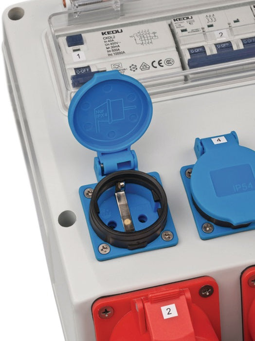 wytrzymała, odporna na uszkodzenia i uderzenia obudowa z tworzywa sztucznego - przystosowana do solidnego montażu na ścianie - ergonomicznie ukształtowany uchwyt do wygodnego przenoszenia - osłona bezpieczników - wyłącznik różnicowoprądowy 30 mA zwiększający bezpieczeństwo - gniazda styków ochronnych 230 V rozmieszczone na wszystkich 3 fazach