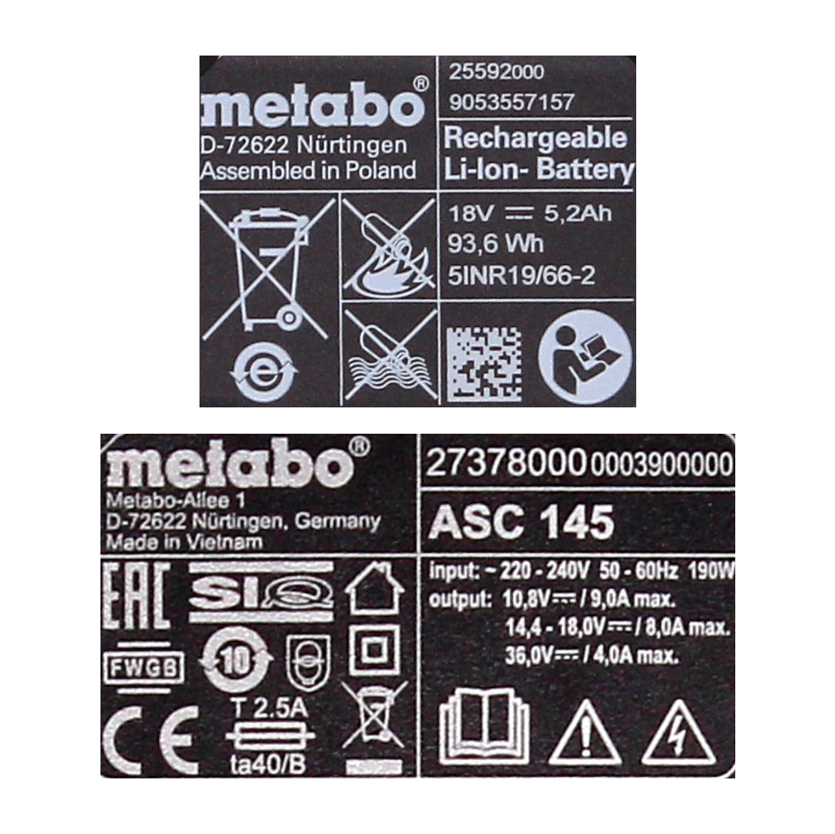 Podstawowy zestaw Metabo 3x akumulator Li-Power 18 V 5,2 Ah CAS Li-Ion ( 3x 625028000 ) + szybka ładowarka ASC 145 ( 627378000 ) + MetaLoc