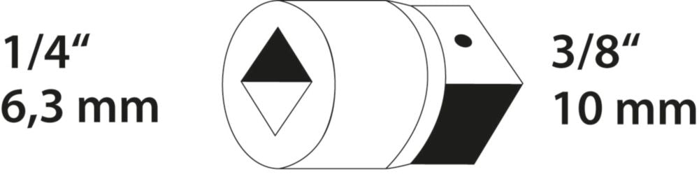napęd kwadratowy 6,3 mm (1/4 ″) - do ręcznie obsługiwanych kluczy nasadowych - z blokadą kulkową - stal wanadowa - chromowane - napęd kwadratowy 6,3 mm (1/4 ″) do napędu kwadratowego 10 mm (3/8 ″) DIN 3123 / ISO 3316