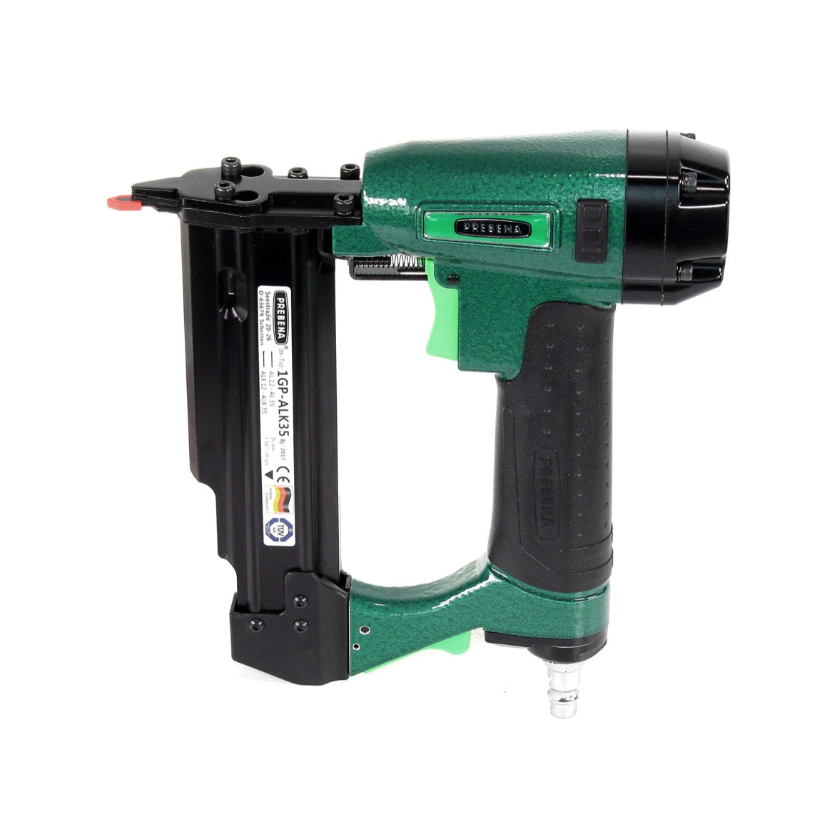 Gwoździarka pneumatyczna 1GP-ALK 35 firmy Prebena oferuje optymalną obsługę do wszechstronnego zastosowania dzięki niewielkiej wadze i optymalnej łatwości obsługi. Gwoździarka jest wyposażona w przyjazną dla użytkownika dźwignię zwalniającą i praktyczny zatrzask magazynka. Wysokiej jakości magazynek typu under-loading zapewnia szybkie przeładowanie i umożliwia oddanie pojedynczego strzału. Ergonomiczna rękojeść jest pokryta powłoką antypoślizgową i posiada okienko do podglądu poziomu napełnienia magazynka. Gwoździarka pneumatyczna Prebena 1GP-ALK35 jest bardzo łatwa w konserwacji i imponuje płynnie działającym systemem spustowym. Pomimo szybkiej sekwencji odpalania, gwoździarka jest niezwykle cicha i cicha, a mimo to pracuje z dużą siłą uderzenia i niskim zużyciem powietrza. Obszary zastosowań obejmują profile dekoracyjne, ornamenty, listwy przyszybowe, listwy i wiele innych.