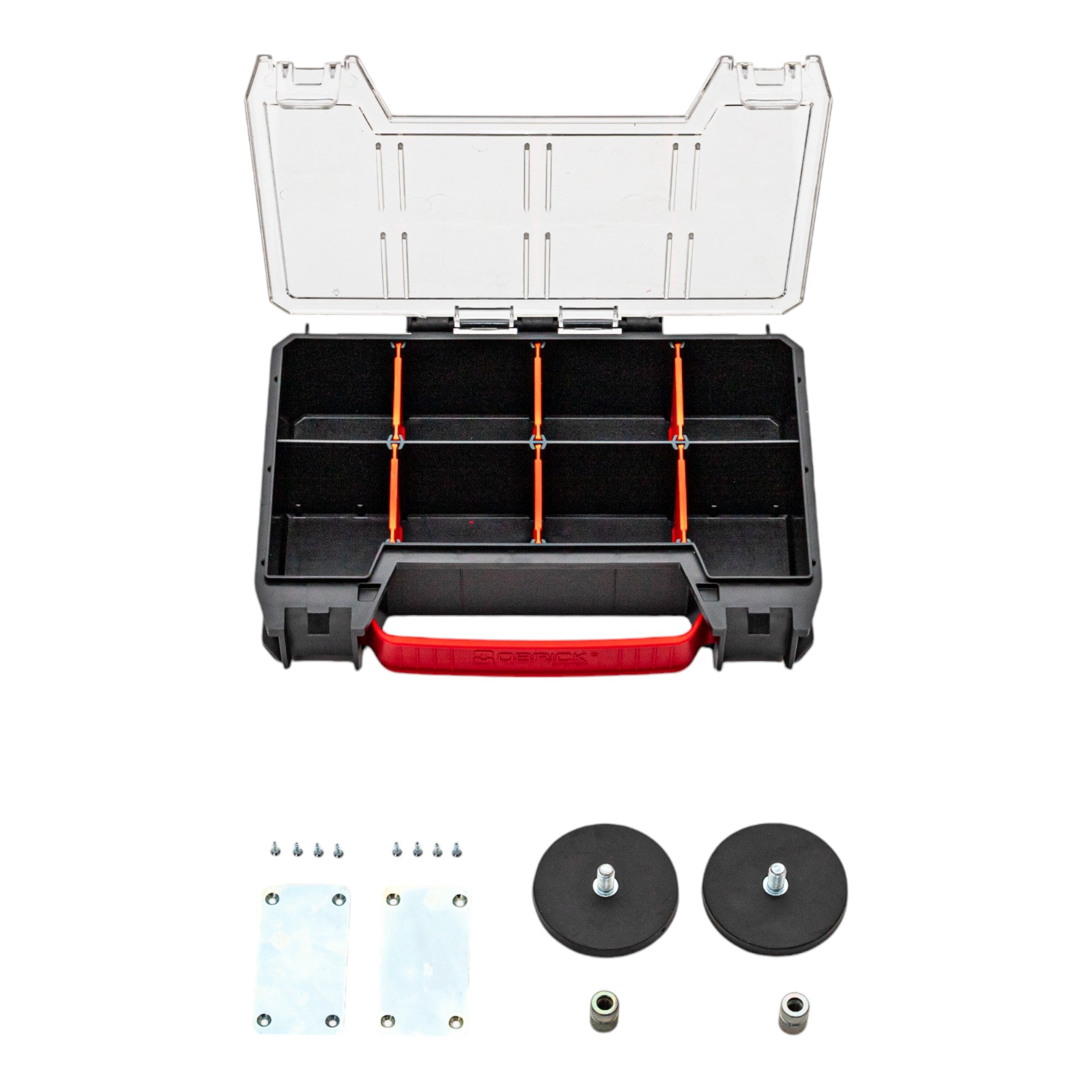 - 1x Qbrick System PRO Organizer Multi - 2x magnes - 2x tuleja na śrubę - 2x metalowa płytka - 8x śruba