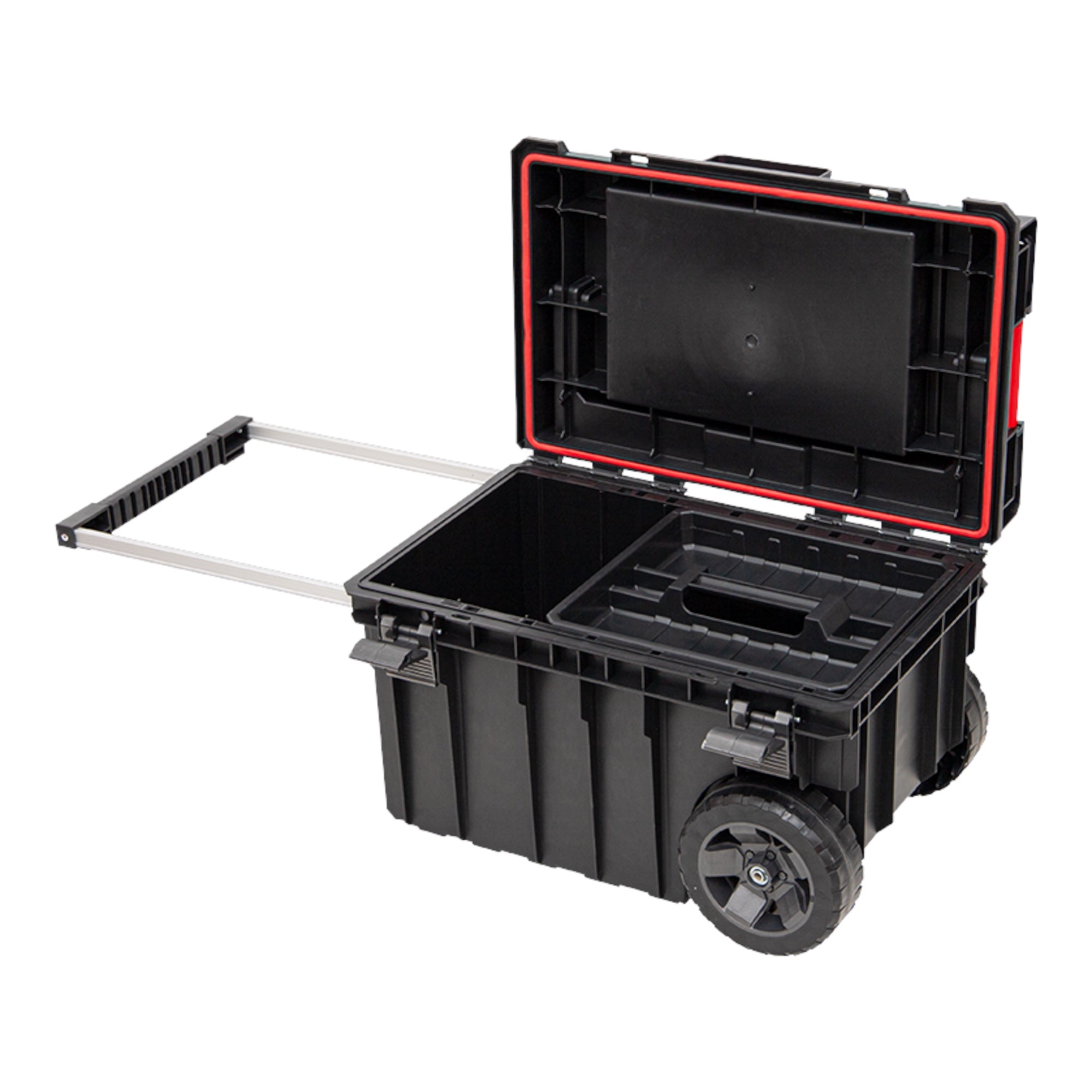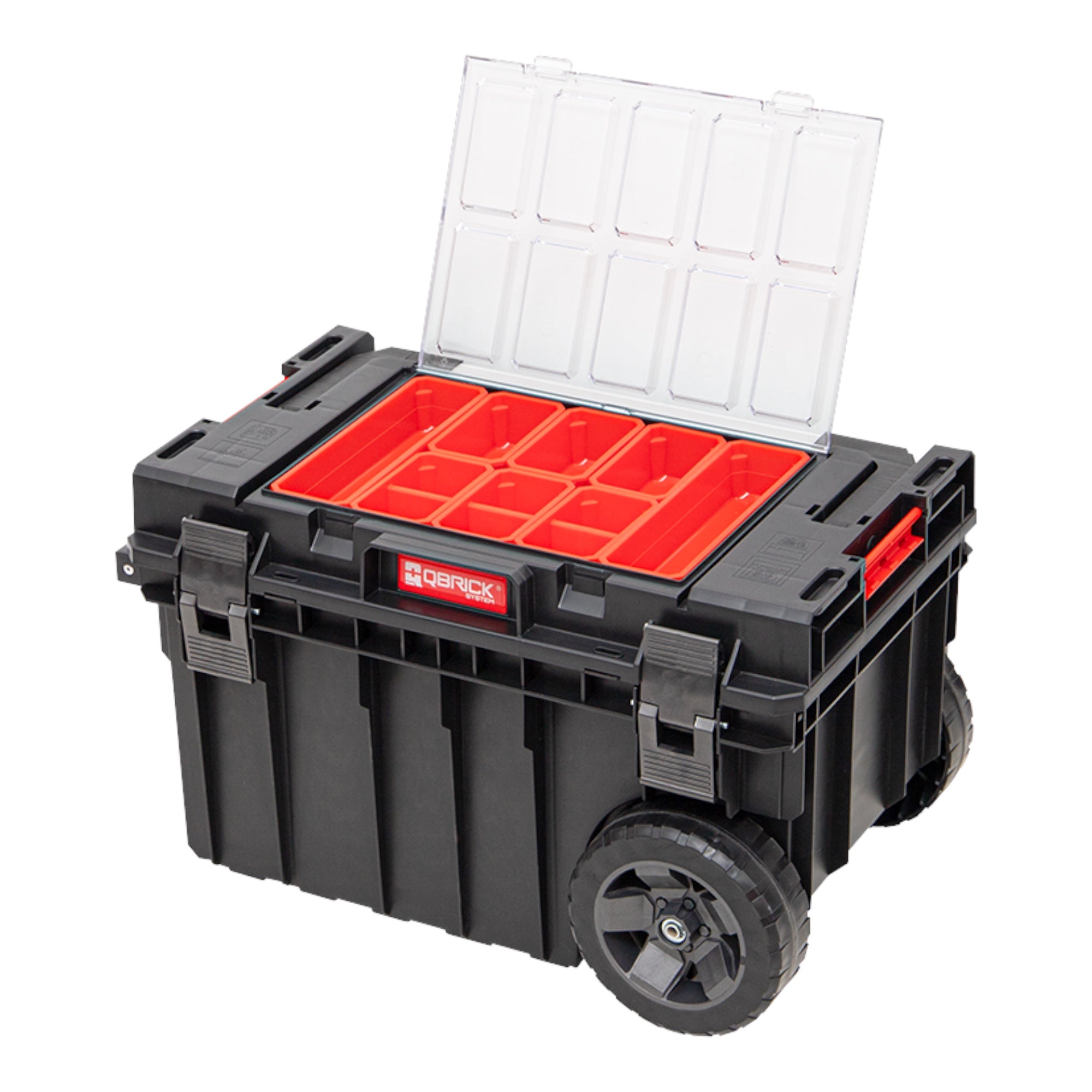 Duża skrzynka narzędziowa na kółkach zapewniająca doskonałą mobilność systemów modułowych Qbrick. Dwa koła zamontowane na metalowej osi umożliwiają bezpieczny transport zestawów skrzynek i organizerów. Aluminiowa, wysuwana na bok rączka teleskopowa zapewnia wygodny dostęp do wnętrza skrzynki i pozwala na wygodne przenoszenie skrzynki w połączeniu z innymi elementami linii ONE, które mocowane są za pomocą poliamidowych łączników. Prosty mechanizm wysuwanego uchwytu podwójnego teleskopu blokuje się po lekkim stuknięciu w uchwyt od dołu. Zawartość pudełka jest wyposażona w praktyczną tackę i elastyczną uszczelkę, która chroni zawartość pudełka przed wnikaniem kurzu i wody. Nowa pokrywa EXPERT oferuje nowe opcje przechowywania. Wyposażona w 8 wiader w różnych rozmiarach, umożliwia przechowywanie małych i długich akcesoriów warsztatowych. Długi aluminiowy uchwyt zapewnia wysoką ergonomię podczas transportu.