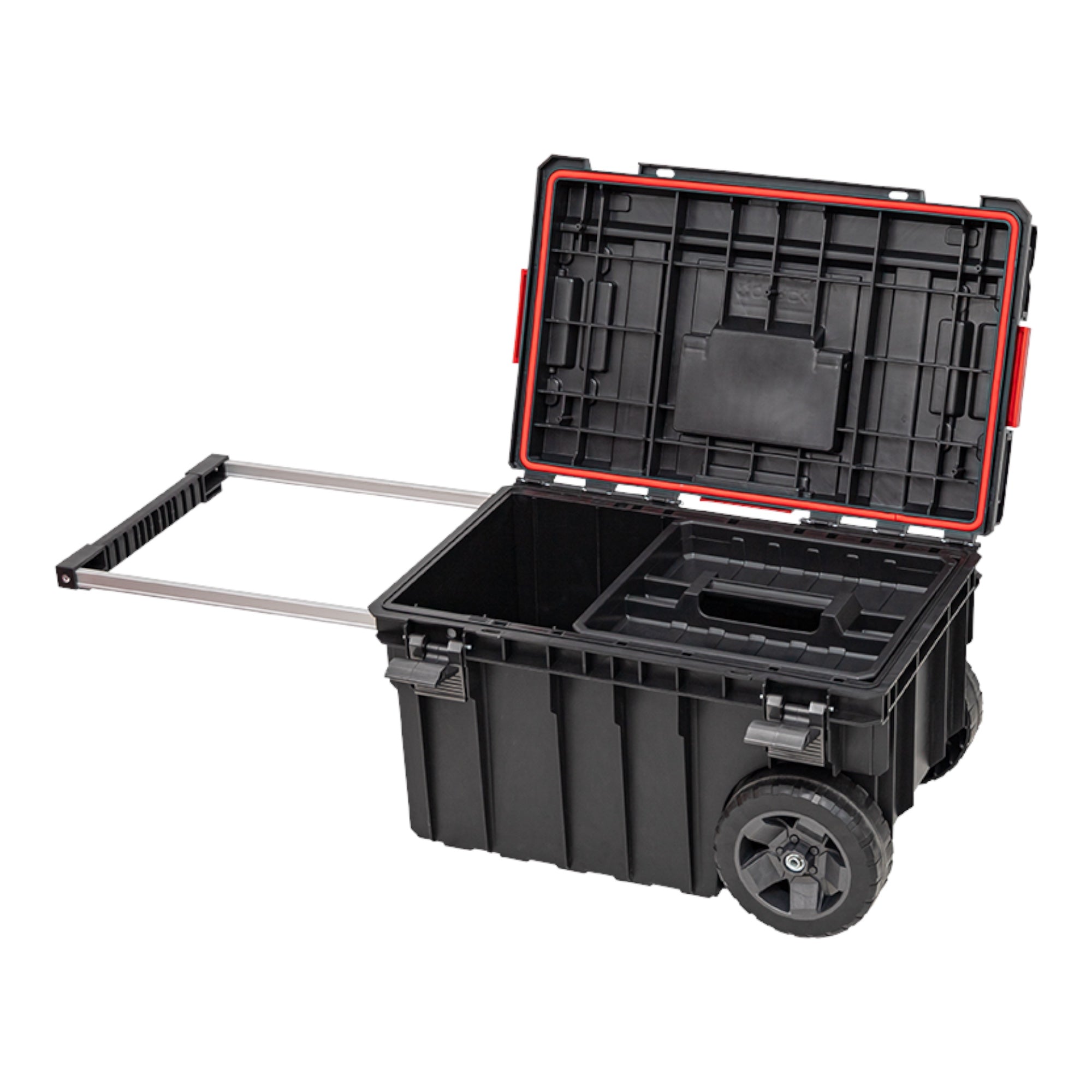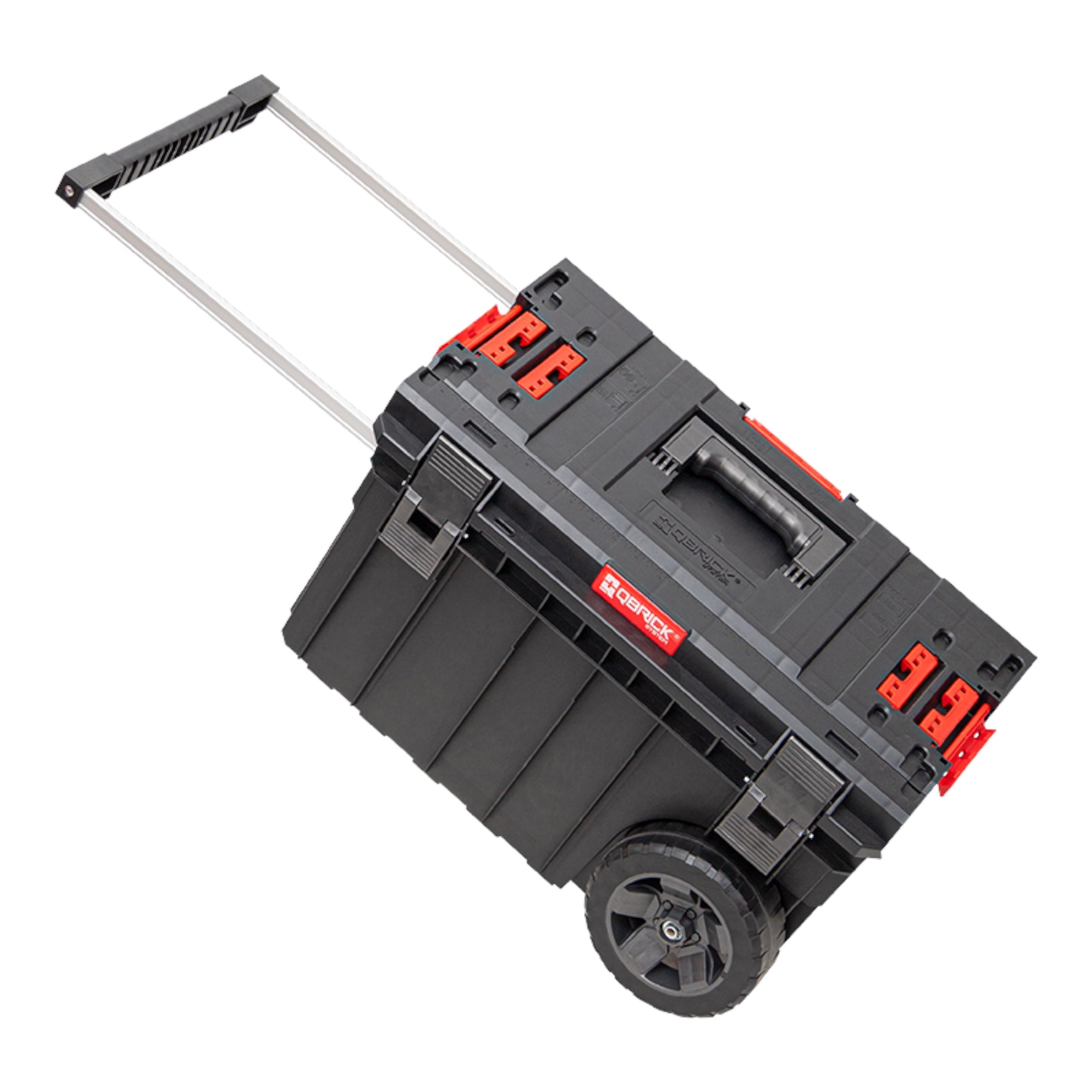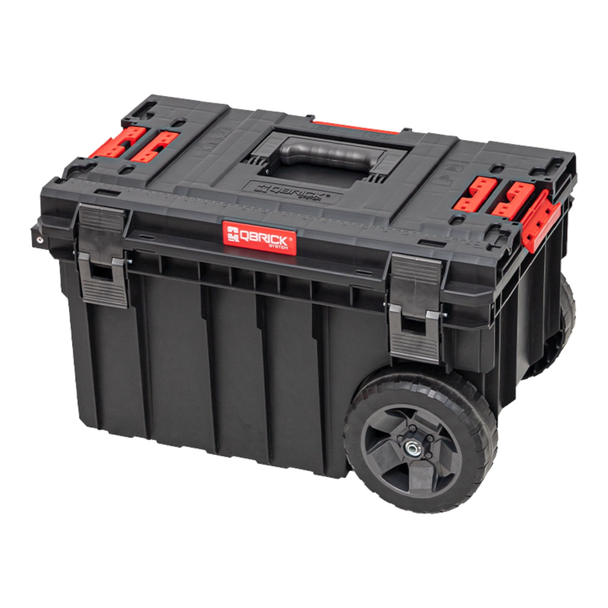 Duża skrzynka narzędziowa na kółkach zapewniająca doskonałą mobilność systemów modułowych Qbrick. Dwa koła zamontowane na metalowej osi umożliwiają bezpieczny transport zestawów skrzynek i organizerów. Aluminiowa rączka teleskopowa wysuwana na bok zapewnia łatwy dostęp do wnętrza skrzynki i pozwala na wygodne przenoszenie skrzynki w połączeniu z innymi elementami linii ONE, które są mocowane za pomocą poliamidowych łączników. Prosty mechanizm wysuwanego uchwytu podwójnego teleskopu blokuje się po lekkim stuknięciu w uchwyt od dołu. Zawartość pudełka jest wyposażona w praktyczną tackę i elastyczną uszczelkę, która chroni zawartość pudełka przed wnikaniem kurzu i wody. Standardowa pokrywa VARIO jest wyposażona w dodatkowe złącza, które umożliwiają podłączenie tej wersji pokrywy do modeli Toolbox z linii Qbrick System PRO (500, Toolcase, Toolbox, Organiser 100, 200, 300 i alternatywnie PRO 600). Jest to unikalna wersja skrzynki, dzięki której użytkownik może połączyć elementy z dwóch linii produktowych.