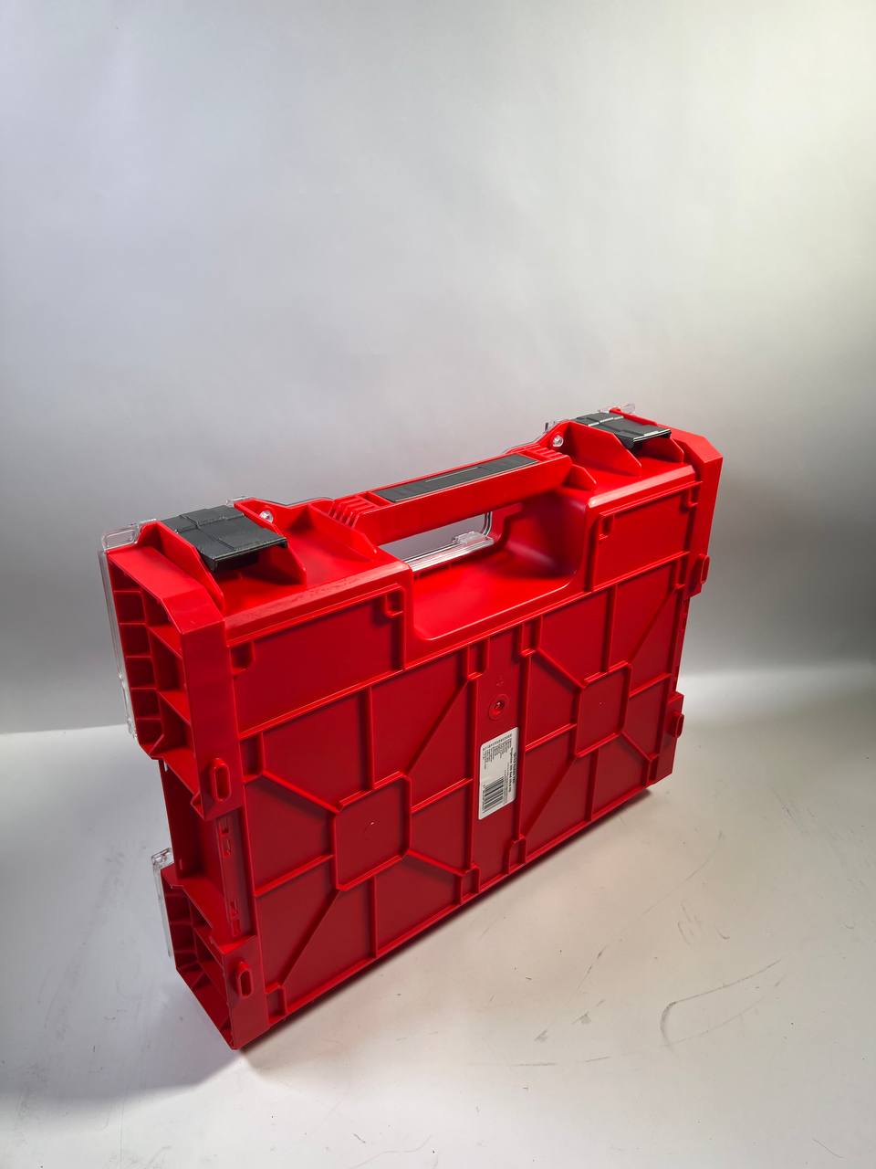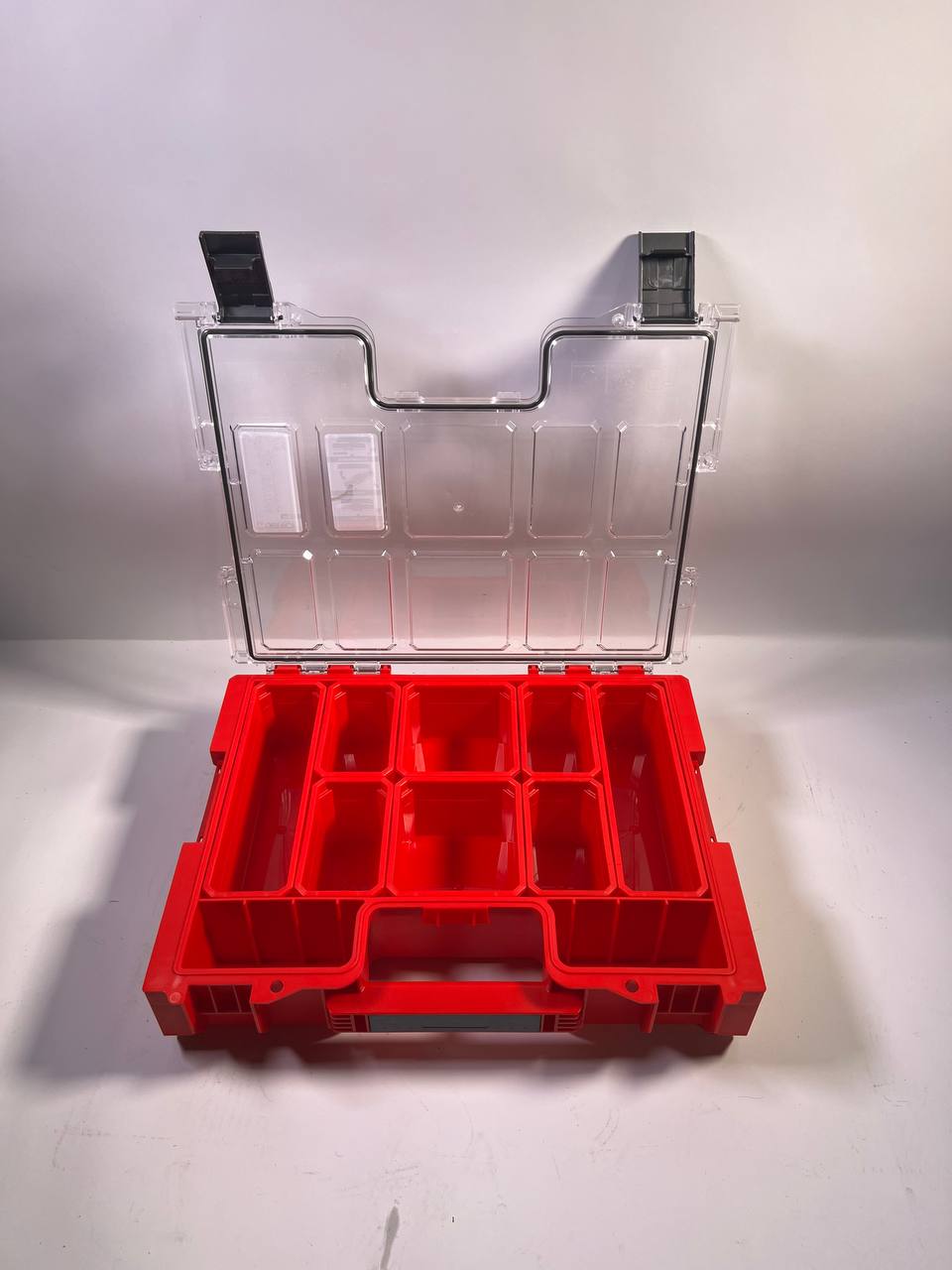 RED ULTRA HD to specjalna edycja produktów Qbrick System PRO wykonana z ultra wytrzymałego tworzywa sztucznego, które charakteryzuje się wyjątkową odpornością na uszkodzenia mechaniczne. Przeprowadzone testy udarności potwierdzają jego wyjątkową trwałość, nawet w warunkach poniżej 0°C. Qbrick System PRO Organizer 300 to największy model organizera z linii PRO. Oprócz rozwiązań znanych z innych modeli, takich jak opatentowany Easy Access System, uszczelka w pokrywie, super wytrzymała pokrywa z poliwęglanu, poliamidowe łączniki boczne i przednie zamknięcia oraz mocny uchwyt, oferuje głębszy korpus, dzięki czemu jest bardziej pakowny. Jest wyposażony w 8 wiader w różnych rozmiarach, w tym dwa długie wiadra do przechowywania długich akcesoriów warsztatowych.