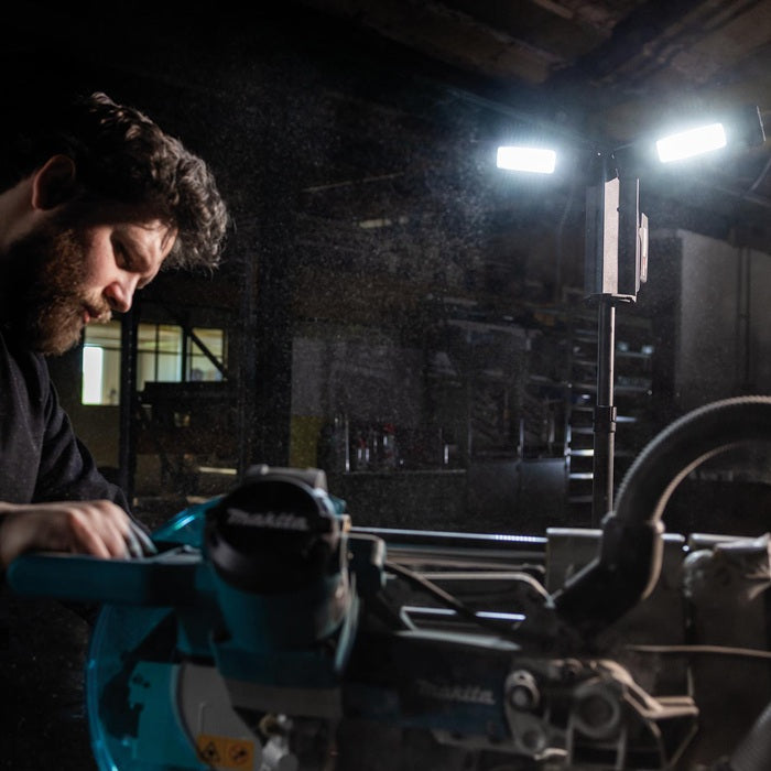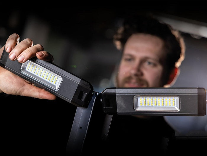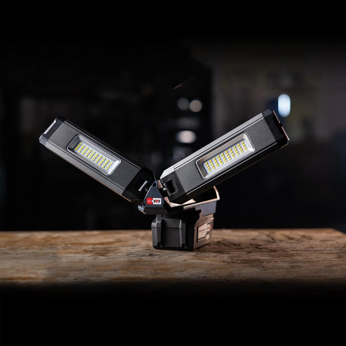 Niezwykle mocna lampa robocza - Niezwykle wysoki strumień świetlny do 2500 lumenów - Regulacja strumienia świetlnego w 2 stopniach, 50% i 100% Dostarczana bez akumulatora/złącza