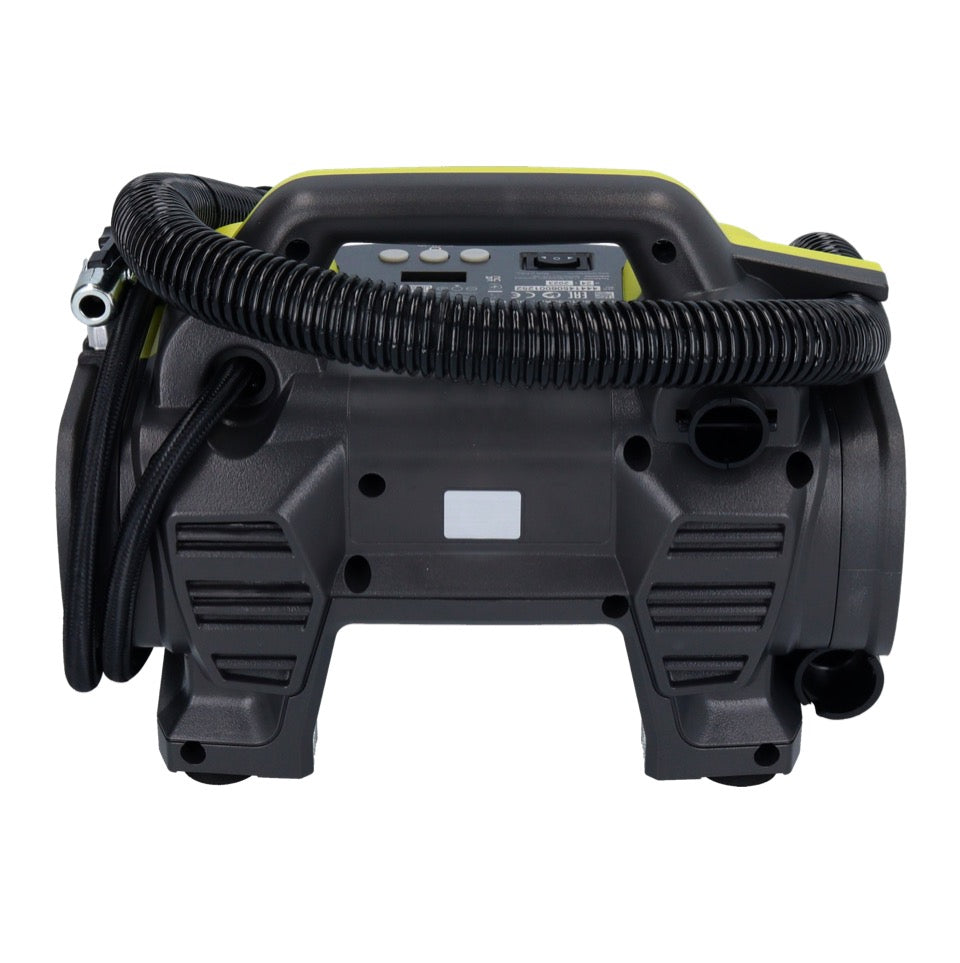 Kompresor akumulatorowy Ryobi 18 V ONE+ to idealne narzędzie dla każdego, kto regularnie musi nadmuchiwać pontony, materace powietrzne, opony samochodowe lub piłki. Dzięki mocnemu silnikowi i zmiennemu zakresowi ustawień ciśnienia może być używany zarówno do zadań o niskim, jak i wysokim ciśnieniu. Kompresor akumulatorowy posiada zintegrowany schowek na akcesoria, dzięki czemu zawsze masz wszystko pod ręką i nie zgubisz żadnych akcesoriów. Ponadto kompresor może być również używany do szybkiego opróżniania powietrza, na przykład do szybkiego i łatwego opróżniania materacy powietrznych lub nadmuchiwanych łodzi. Funkcja automatycznego wyłączania jest szczególnie praktyczna, ponieważ można ustawić żądane ciśnienie, a kompresor wyłączy się automatycznie po jego osiągnięciu. Dzięki temu można mieć pewność, że nadmuchiwana łódź, materac powietrzny lub opony samochodowe zawsze mają odpowiednie ciśnienie. Aby jeszcze bardziej ułatwić korzystanie z kompresora, posiada on schowek na wąż bezpośrednio na urządzeniu. Ułatwia to przechowywanie węża, gdy kompresor nie jest używany. Cyfrowy wyświetlacz ciśnienia LCD zawsze zapewnia precyzyjny przegląd bieżącego ciśnienia i umożliwia jego łatwe ustawienie. Oznacza to, że zawsze masz pełną kontrolę nad procesem pompowania.