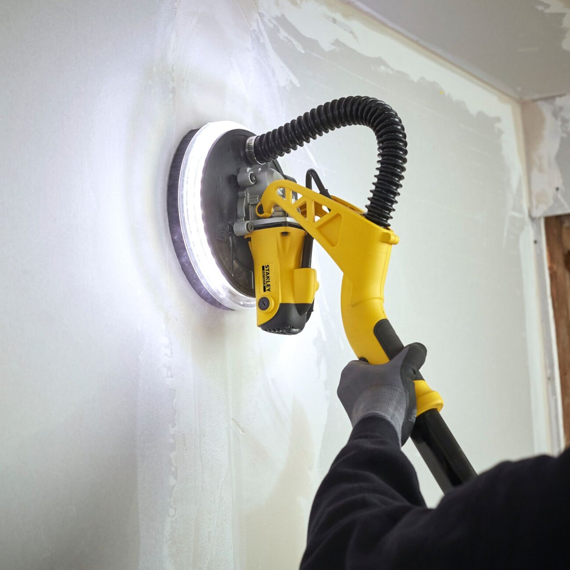 Szlifierka do suchej zabudowy Stanley Fatmax SFMEE500S to idealne rozwiązanie do wymagających prac szlifierskich na ścianach i sufitach. Solidny silnik o mocy 750 W zapewnia wysoką wydajność szlifowania i umożliwia szybką i precyzyjną pracę. Kompaktowy, ergonomiczny kształt i lekka konstrukcja minimalizują zmęczenie, nawet podczas długich okresów użytkowania. Wstępny wybór prędkości od 600 do 1700 obr/min z funkcją łagodnego rozruchu zapewnia optymalne dostosowanie do różnych zastosowań, a pierścień świetlny LED oświetla obszar roboczy i uwidacznia spoiny, plamy lub nierówności. Teleskopowy uchwyt, który można wydłużyć do 180 cm, jest idealny do prac sufitowych i szlifowania większych powierzchni. Elastyczny wąż ssący zapewnia maksymalną elastyczność przy kącie szlifowania do 120°, a zdejmowana osłona szlifierska umożliwia szlifowanie w narożnikach. Dzięki zakrzywionej konstrukcji uchwytu głowicy i gumowanym powierzchniom uchwytu szlifierka zapewnia optymalne wyważenie i wysoki poziom komfortu użytkowania. Składany uchwyt i dołączona torba narzędziowa ułatwiają przechowywanie i transport. Szlifierka Stanley Fatmax SFMEE500S to doskonały wybór do profesjonalnych prac w suchej zabudowie, w których liczy się wydajność, precyzja i wygoda.