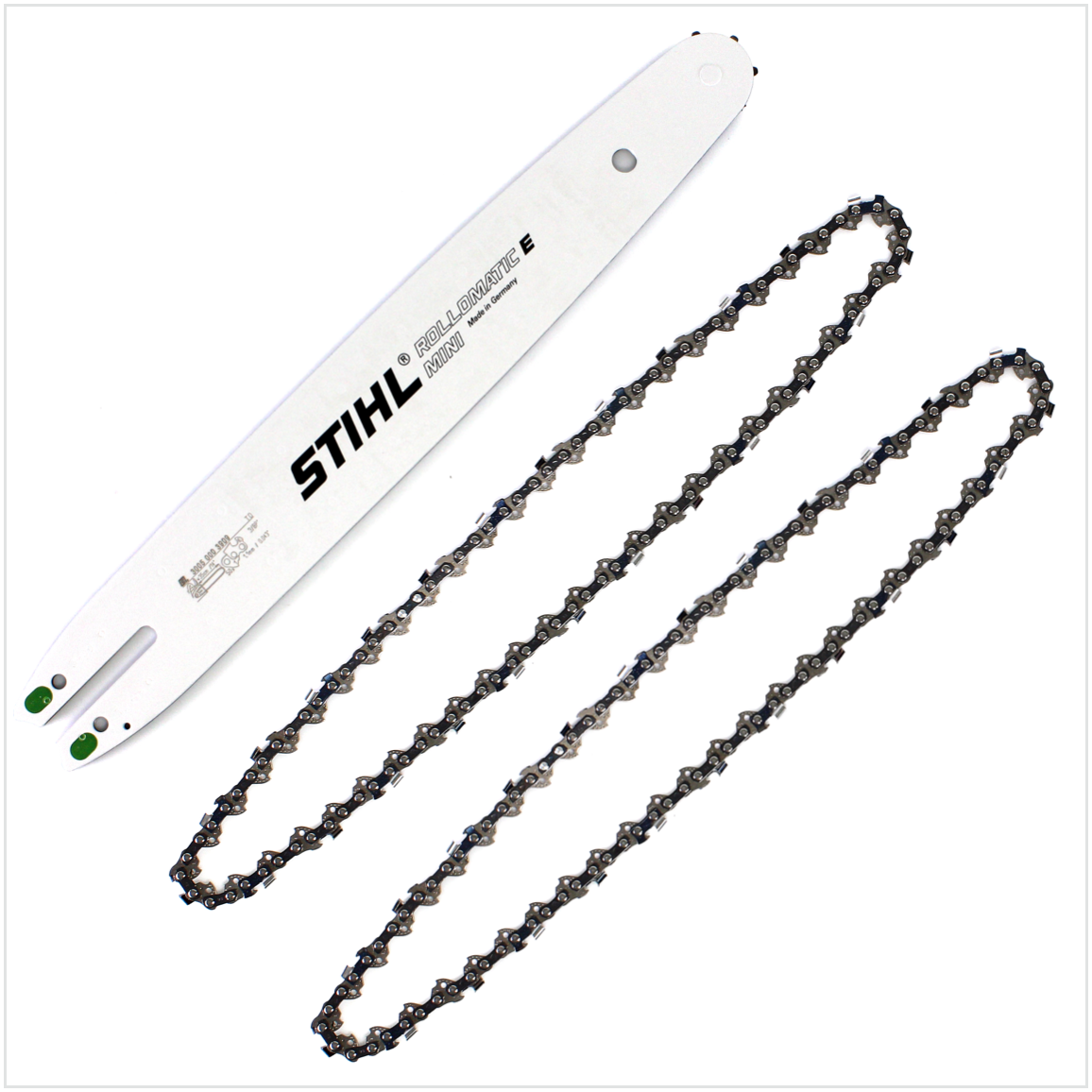 Die schmale Führungsschiene für leichte Stihl Kettensägen. Durch das geringe Gewicht bei erhöhter Schnittleistung wird nur wenig Kraft für die Arbeit benötigt,  Diese Hochleistungs-Führungsschiene wird aus federhartem Stahl gefertigt, die Kettenlaufbahn ist induktiv gehärtet. Geeignet für die feingliedrige Sägeketten 3/8" Picco Micro oder1/4" Picco Micro 3. Diese Sägekette für die Einstiegsklasse ist robust, vibrationsarm und belastbar. Die Kette hat einen schmalen Schnitt und ist dadurch sehr rückschlagsarm und äußerst schnittstark. Das Oilomatic Schmiersystem von Stihl sorgt für noch weniger Reibung und Verschleiß.