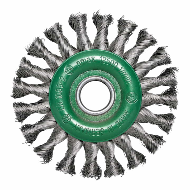 Okrągła szczotka pleciona o jakości przemysłowej do uniwersalnego zastosowania na wszystkich standardowych szlifierkach kątowych - agresywne i szybkie czyszczenie - wszystkie końcówki drutu są używane w tym samym czasie - długa żywotność - certyfikat TÜV-Süd (test bezpieczeństwa - monitorowana produkcja) - do szorstkowania, gratowania i prostego usuwania rdzy ze stali, stali nierdzewnej - otwór Ø 22,2 mm