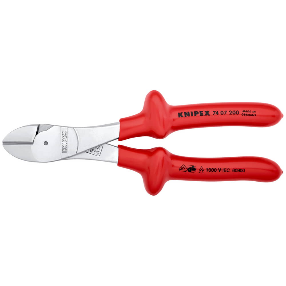 Izolacja VDE do 1000 V - wyprodukowane zgodnie z normą DIN EN/IEC 60900, testowane na sztukach - 20% mniejsza siła niż w przypadku konwencjonalnych nożyc ukośnych - krawędzie tnące dodatkowo hartowane indukcyjnie, twardość krawędzi tnących ok. 64 HRC - wysokowydajna stal chromowo-wanadowa, kute, wielostopniowo hartowane w oleju szczypce chromowane