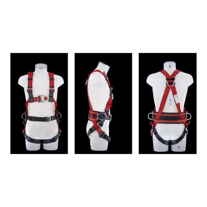EN 361, EN 358 - z wyściełaną częścią tylną 100/140 mm - dwa oczka zabezpieczające (z przodu i z tyłu) oraz dwa boczne oczka pozycjonujące, pozwalające użytkownikowi ustawić swoje stanowisko pracy - opcje regulacji pasów naramiennych, pasów na nogi (z ramą przelotową) i pasa bezpieczeństwa - pas biodrowy z ramą przelotową