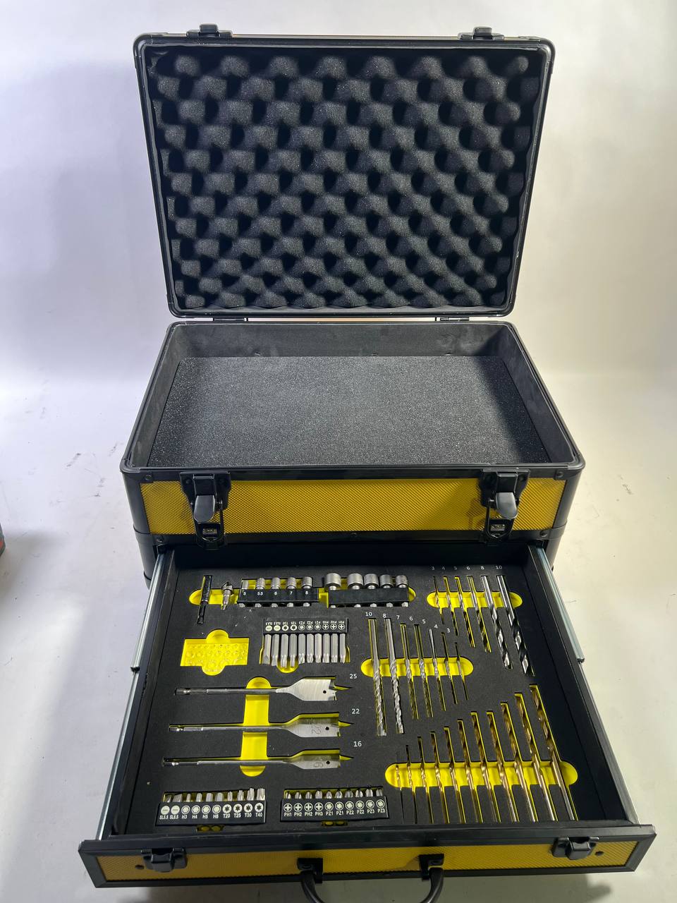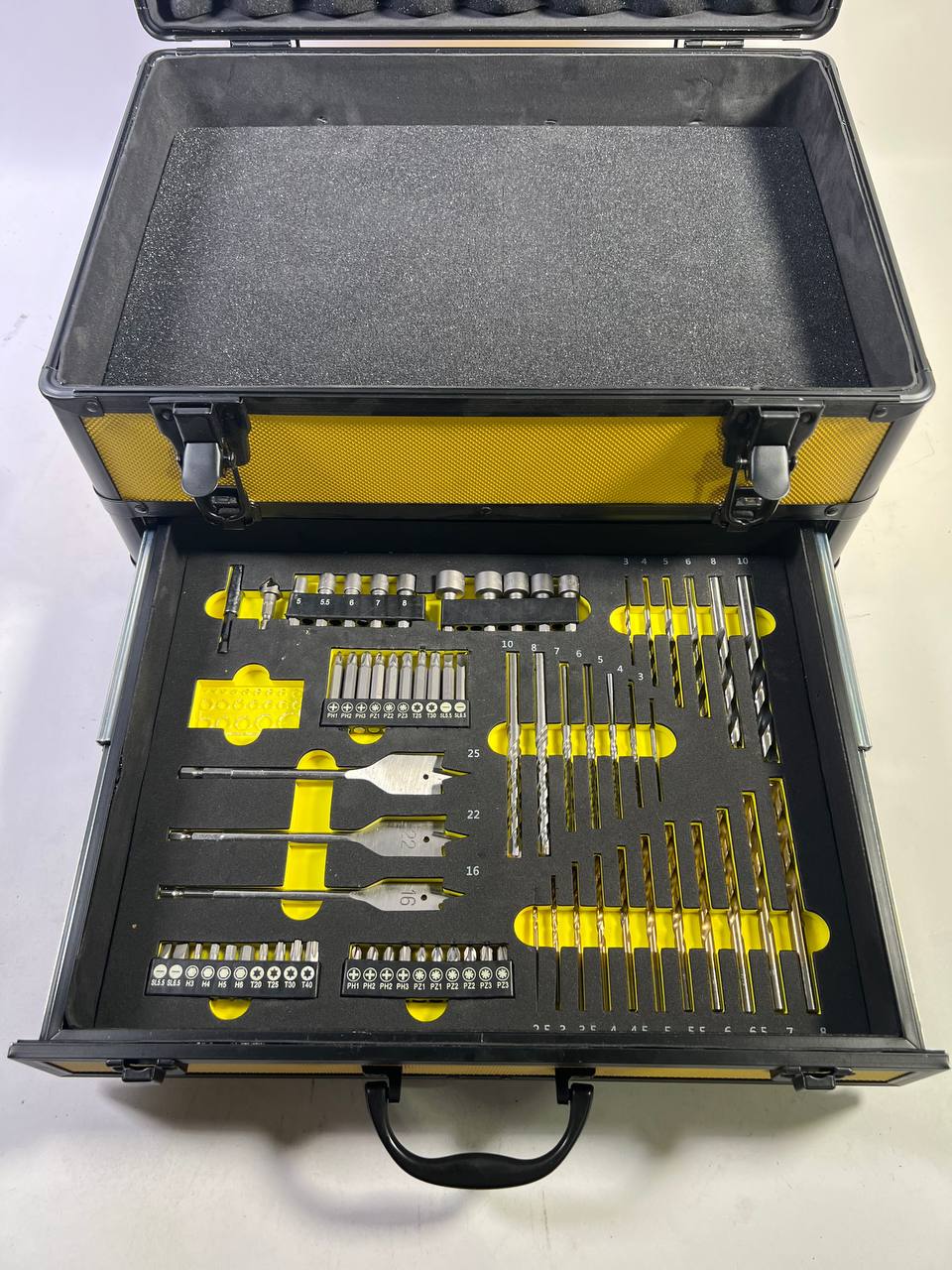 Der Toolbrothers TX Aluminium Werkzeugkoffer bietet, mit seiner universell anpassbaren Würfelschaumeinlage, ausreichend Platz für eine Maschine ( z.B. einen Schlagschrauber ), ein Ladegerät und bis zu zwei Akkus. Durch das in der Schublade vorhandene 70 teilige Bit und Bohrer Set sind sämtliche Anwendungen abgedeckt. Es sind Bits, Fräser, Steckschlüssel und Bohrer in vielen Varianten vorhanden. Ob Holz, Metall oder Stein der Koffer beinhaltet eine Vielzahl an Bohrern in den gängigsten Größen. Die gute Verarbeitung des Koffers verspricht eine lange Lebensdauer und ist zudem auch echt schön anzusehen. Der gummierte Tragegriff ist schonend für die Handinnenflächen und kann auch problemlos mit Handschuhen genutzt werden. Die Metallverschlüsse des Koffers sind robust und langlebig. Die Einlagen im Boden und im Deckel gewährleisten einen sicheren Transport der im Koffer befindenden Maschinen. Durch den Aluminium Koffer TX hat man das Arbeitswerkzeug und das entsprechende Zubehör in einem Koffer und sicher gelagert.