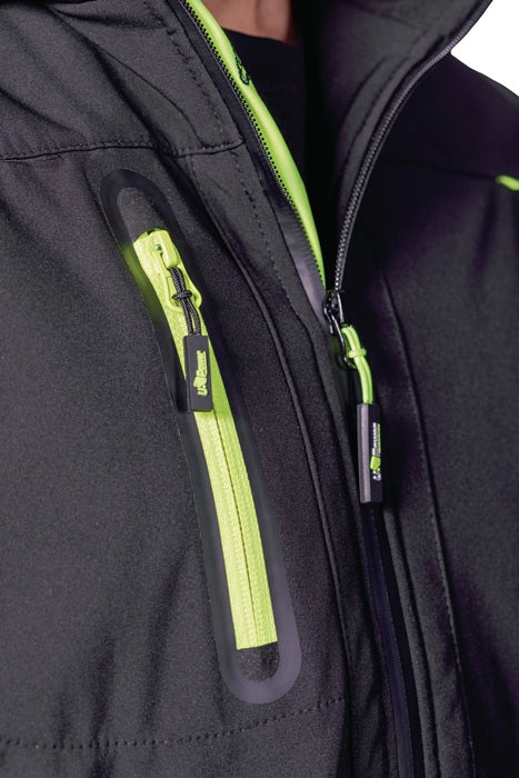 96% Polyester / 4% Elastan, ca. 320 g/m² · Jacke aus Softshell mit U-Tex Membrane · wasserabweisender Stoff, luftdurchlässig und winddicht · sehr bequeme und widerstandsfähige Jacke mit einem Innenfutter aus weichem, leuchtendem Microfleece · zentraler Verschluss mit wasserdichtem Reißverschluss · reflektierende Einsätze für maximale Sichtbarkeit · vorgeformte Ärmel für eine optimale Passform · Kapuze einstellbar und abnehmbar · elastische, winddichte Ärmelbündchen mit Daumenloch und Klettverschluss · ausgestattet mit zwei vorderen, geschlossenen Taschen mit leuchtendem Reißverschluss und Kordelzug in den Taschen um ein Hängenbleiben zu vermeiden · Handytasche auf der Brust mit Free Sound Technologie und schließbar mit leuchtendem Reißverschluss · zwei große Innentaschen · eine zusätzliche, verschweißte Tasche am linken Ärmel · Reflexband am Kragen auf Anfrage lieferbare Größen: S-5XL