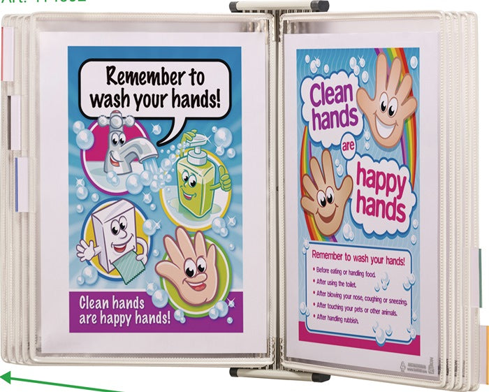 Kompletny zestaw - Wspornik ścienny, blacha stalowa, jasnoszary RAL 7035 - Z 10 antybakteryjnymi tablicami ekspozycyjnymi A4 wykonanymi z wytrzymałego, elastycznego PVC, z drutem stalowym pokrytym tworzywem sztucznym - Otwór u góry - Z 5 prowadnicami zatrzaskowymi 50 mm - Z 4 zaślepkami (ogranicznikami) zapewniającymi idealny kąt odczytu - Elementy ścienne można ustawić w dowolnej liczbie - Zawiera materiał mocujący
