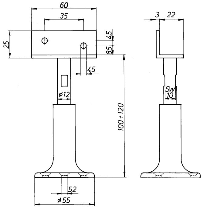 regulowana wysokość - aluminium - ze wspornikiem - płyta podstawy z otworami na śruby - regulowana za pomocą gwintu M12 - dla wysokości od 100 do 120 mm
