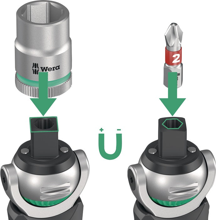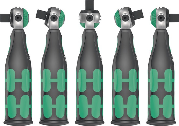 z obrotową i odwracalną grzechotką 8009 Zyklop - z kombinowanym uchwytem narzędziowym przystosowanym do nasadek z napędem kwadratowym 10,0 mm (3/8″) i bitów z napędem sześciokątnym 6,3 mm (1/4″) (C 6,3 i E 6,3) - wielokomponentowa rękojeść Kraftform - zintegrowana z rękojeścią, swobodnie obracający się magazynek z 12 bitami - swobodnie obracająca się głowica zapadkowa (zdefiniowana pozycja 0°, 15° i 90° w lewo i w prawo) - może być używana jak konwencjonalny wkrętak w pozycji 0° - przełączanie lewo/prawo - magnetyczny podbieracz bezpośredni