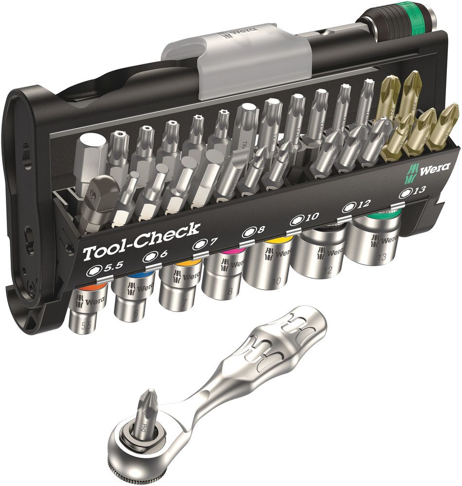 38 narzędzi na najmniejszej przestrzeni wyposażonych w 28 bitów, grzechotkę do bitów (Zyklop - kuta matrycowo konstrukcja z litej stali z bezpośrednim uchwytem do bitów), uchwyt do bitów z uchwytem szybkowymiennym (technologia Rapidaptor) i 7 popularnych wkładek klucza nasadowego, napęd 6,3 mm (1/4″) - do pracy ręcznej i maszynowej (konwencjonalna wkrętarka akumulatorowa) Zawartość: 1 uchwyt do bitów z uchwytem szybkowymiennym (technologia Rapidaptor) (50 mm) 1 grzechotka do bitów (87 mm) 1 bit do wkrętów z rowkiem 1 szt. Rozmiar 5,5 x 1,0 mm* do wkrętów z wgłębieniem krzyżowym (PH) 2 szt. rozmiar 1 / 3 szt. rozmiar 2 / 1 szt. Rozmiar 3* do wkrętów z wgłębieniem krzyżowym (PZD) 1 szt. Rozmiar 1 / 3 szt. rozmiar 2 / 1 szt. Rozmiar 3** dla wkrętów z gniazdem sześciokątnym 1 szt. każdy Rozmiar 3 / 4 / 5 / 6 / 8 mm*** dla wkrętów z wewnętrznym profilem TORX® 1 szt. za sztukę Rozmiar T 10 / 15 / 20 / 25 / 30 / 40* dla wkrętów z wewnętrznym profilem TORX® również z kołkiem blokującym 1 szt. za sztukę Rozmiar T 10 / 15 / 20 / 25 / 30* 1 adapter 6,3 mm (1/4″) z zewnętrznym napędem kwadratowym na 6,3 mm (1/4″) z zewnętrznym napędem sześciokątnym 1 końcówka do klucza nasadowego 6,3 mm (1/4″) z napędem kwadratowym SW 5,5 / 6 / 7 / 8 / 10 / 12 / 13 mm * wytrzymały ze strefą skrętną ** bardzo wytrzymały ze strefą skrętną *** wytrzymały z technologią Hex-Plus
