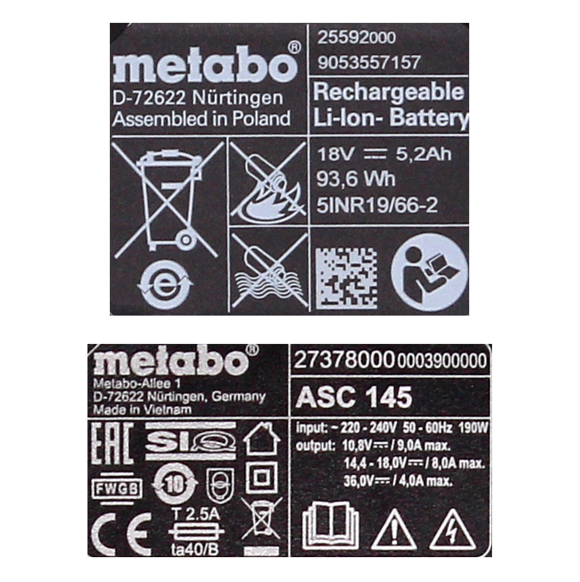 Zestaw podstawowy Metabo 2x akumulator Li-Power 18 V 5,2 Ah CAS Li-Ion ( 2x 625028000 ) + szybka ładowarka ASC 145 ( 627378000 ) + MetaLoc